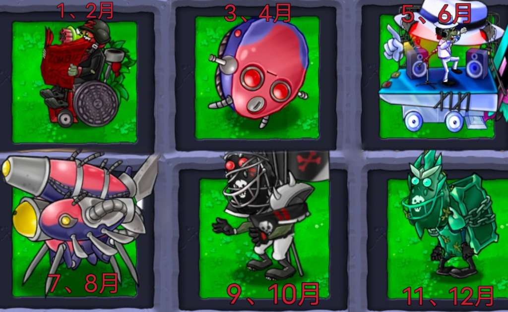 特点:80%反伤,每15秒回复1500血量,限伤2000死亡时为全场植物回复血量,每旗出现3只