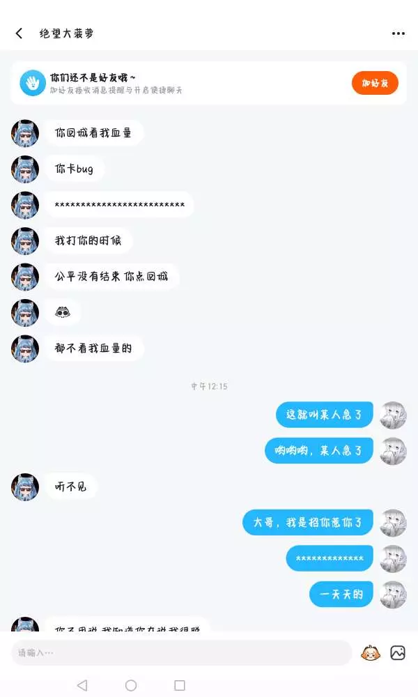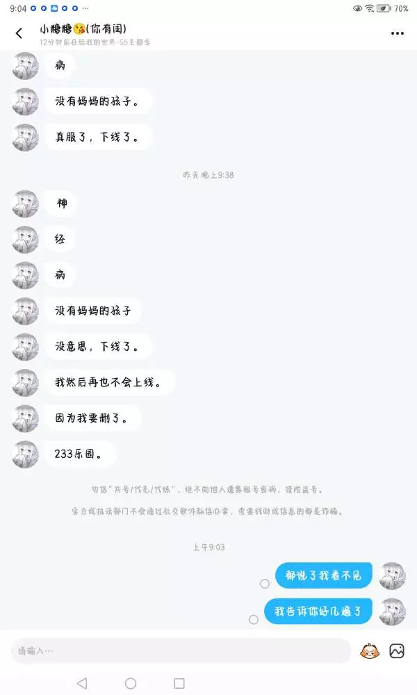 我以前都跟你说了好几十遍了,我在玩我的世界的时候看不见你们信息,看不见看不见。结果呢,你是耳朵聋了还是眼睛瞎了。口口声声的说的知道了,你知道了吗?大姐啥都行。头像也学我不是大哥,你是没手找头像吗?而且。那就拿人身攻击嘛。你骂不过就骂不过呗,直接拿父母呗 666 不好意思,已经举报了哦
