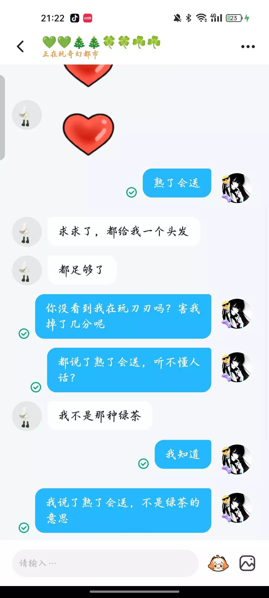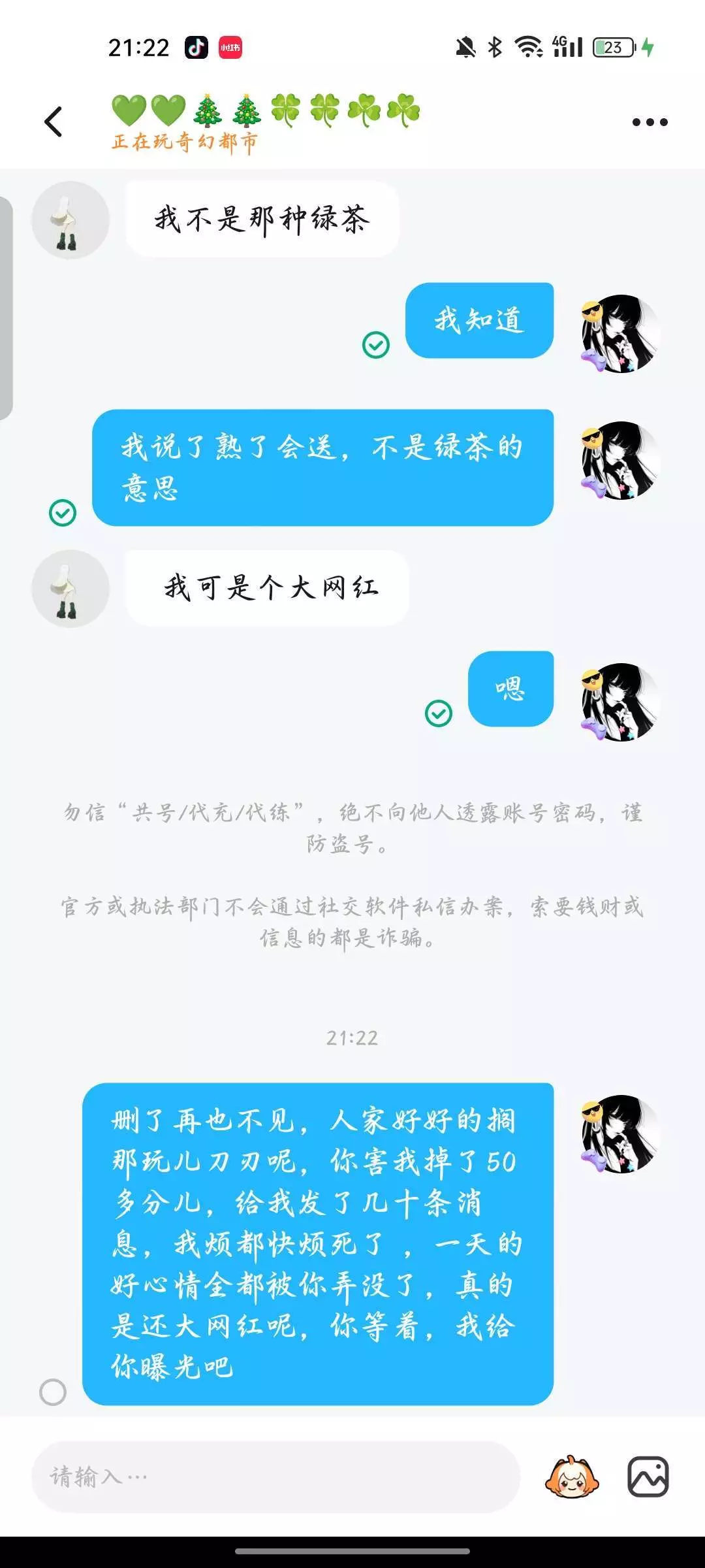 #家人们避雷这迷惑伸手姐。人家正好好打刀刃呢,结果他给我发二十几条消息,搞得我好心情都没了,在关键时刻给我发这么多条消息,我的妈呀,也是个人才,都跟他说了,我在打刀刃,等会儿聊,结果他告诉我,他是个网红什么的,给我气的直接开喷(后面的自己看,不想多打字)...