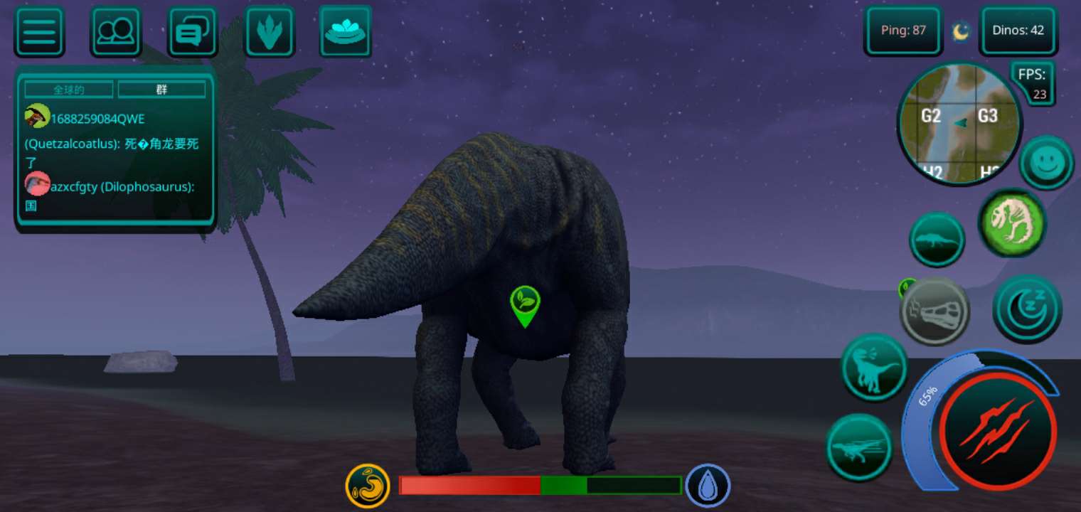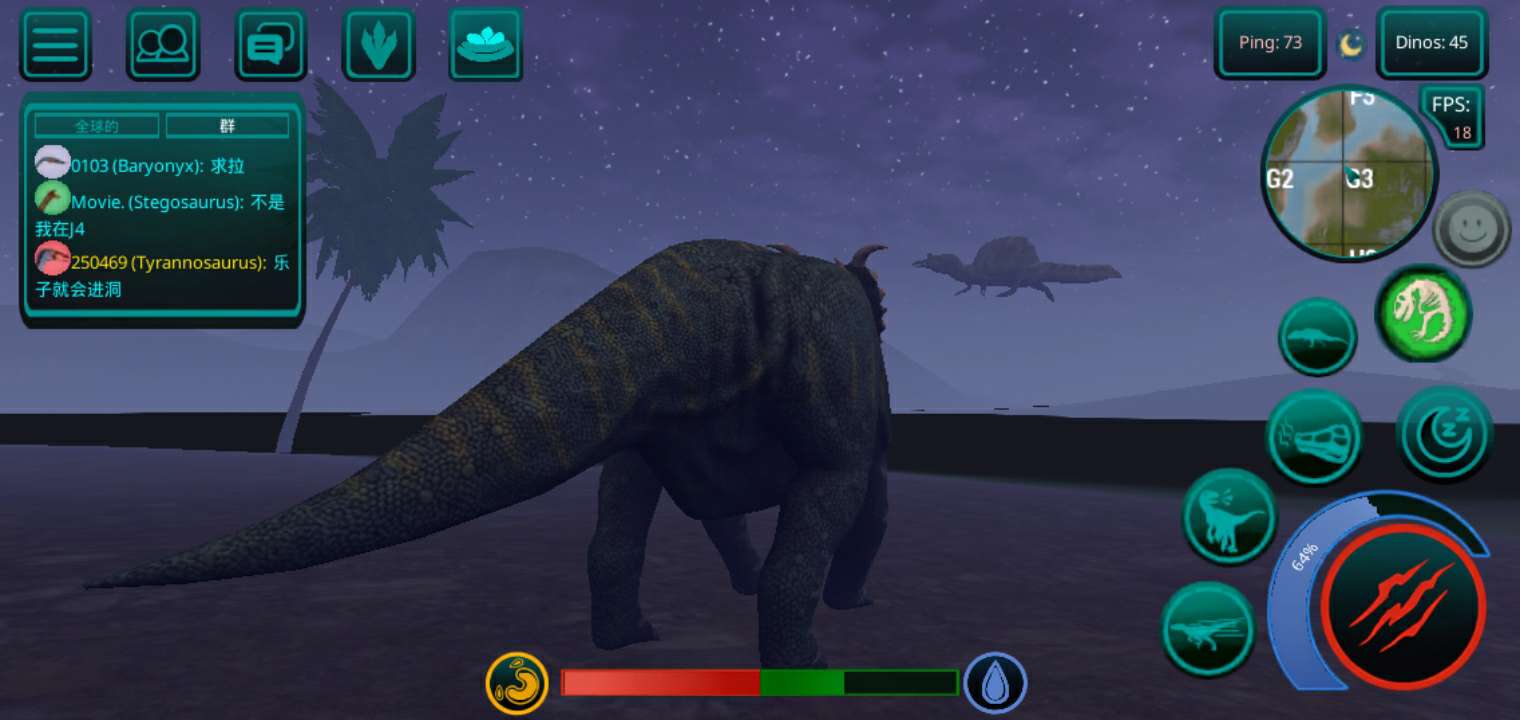 【更新:修复错误,提高稳定性】 恐龙岛是一款以侏罗纪世界为背景的逼真在线恐龙模拟器。 享受各种恐龙、逼真的图形和岛屿大地图。 选择你的恐龙并开始生存, 与您的朋友以及世界各地的玩家一起玩。 游戏中呈现了所有流行的恐龙,例如,从霸王龙、棘龙等食肉动物开始,到三角龙、甲龙等食草动物,游戏中有超过 23 种恐龙,包括飞行和游泳物种,以及所有恐龙。 如何玩诅咒岛 肉食性恐龙在线模拟器 - 恐龙生存和狩猎的游戏特色: 1.成长系统! 恐龙不会立即显得很大,需要照顾。 你需要培养他。你需要生存、寻找食物和饮料,并避免来自其他肉食恐龙(例如巨龙、重爪龙或暴龙)的潜在威胁。 2. 首先,玩家需要选择一种恐龙。 请记住 - 这是您个人的恐龙! 在恐龙游戏中,不仅有肉食性恐龙和草食性恐龙,还有会飞的恐龙,例如翼手龙,玩家可以与自己物种的食肉动物联合成群,以抵抗其他物种,最重要的是,生存! 3.食物提取,如果恐龙是掠食者,那么你需要杀死其他玩家的恐龙才能得到自己的食物,如果你是草食动物,那么食物就更容易了,你需要特殊的蕨类植物,你可以得到足够的他们! 地图上任意湖泊、水库都可以饮用。 4.文字聊天和好友系统。 您可以与世界各地的朋友和玩家聊天、制定策略、缔造和平等等。 并且还可以将玩家添加为好友,并加入到游戏的骨架中