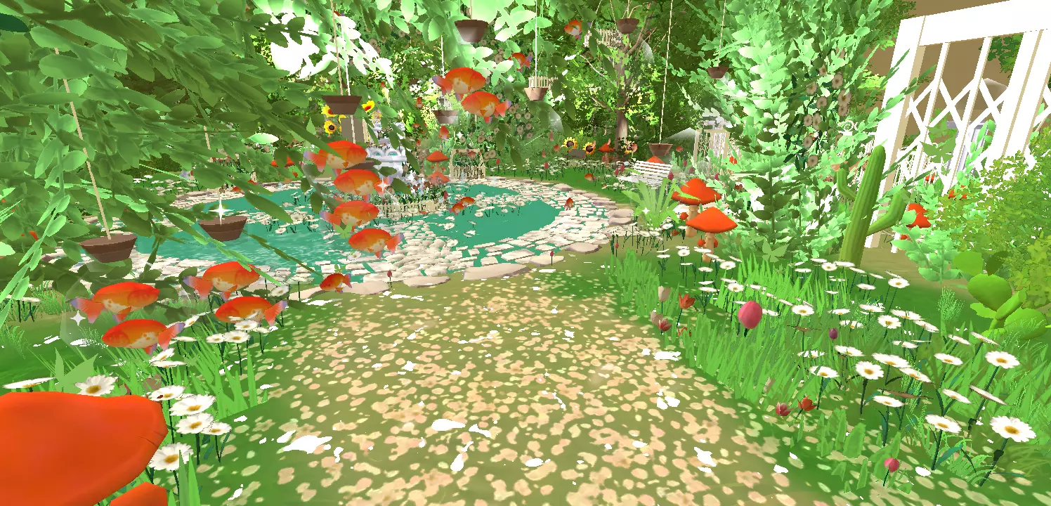 循芳径入深林,见金鳞浮于叶底,落英覆径,红蕈如盖。