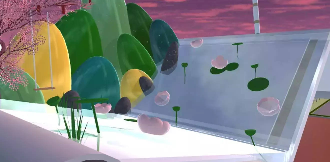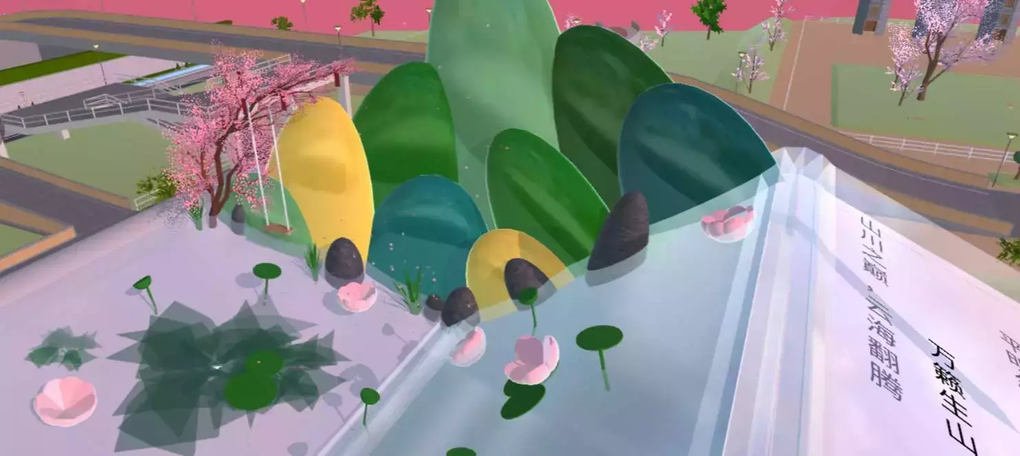 第①部分是一个普通的荷塘(河塘)背景是一座座高山,颜色搭配运用了中式山水画的感觉🏞可以更加融入本建筑🍻一旁由桃树之衬有驱邪作用💨上面我加了些红色的祈福袋,代表的是古人对神明的敬仰🙋🏻♀️放了个秋千专门打卡点👌🏻💥以上是背景,纸章上是河水有许多荷花、荷叶、莲藕还有萍藻💐更清闲的感觉就会有更好的境界🙌🏻