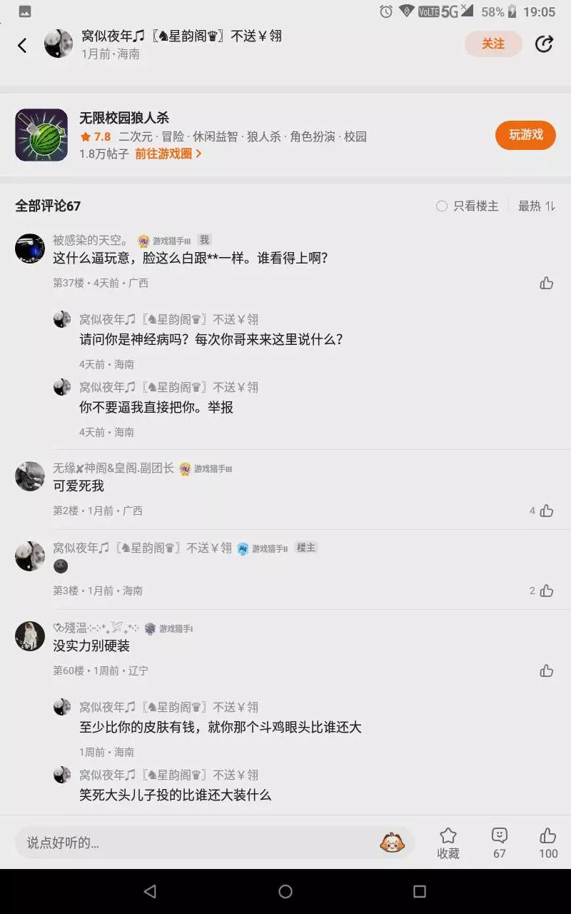 这个人我真的是要无语死,他就发了一个作品,我就随便吐槽几句,然后他就在那里疯狂输出,我往下滑,结果好多人都是在喷他,喷他的人都被他给拉黑了。而且还破如房。
