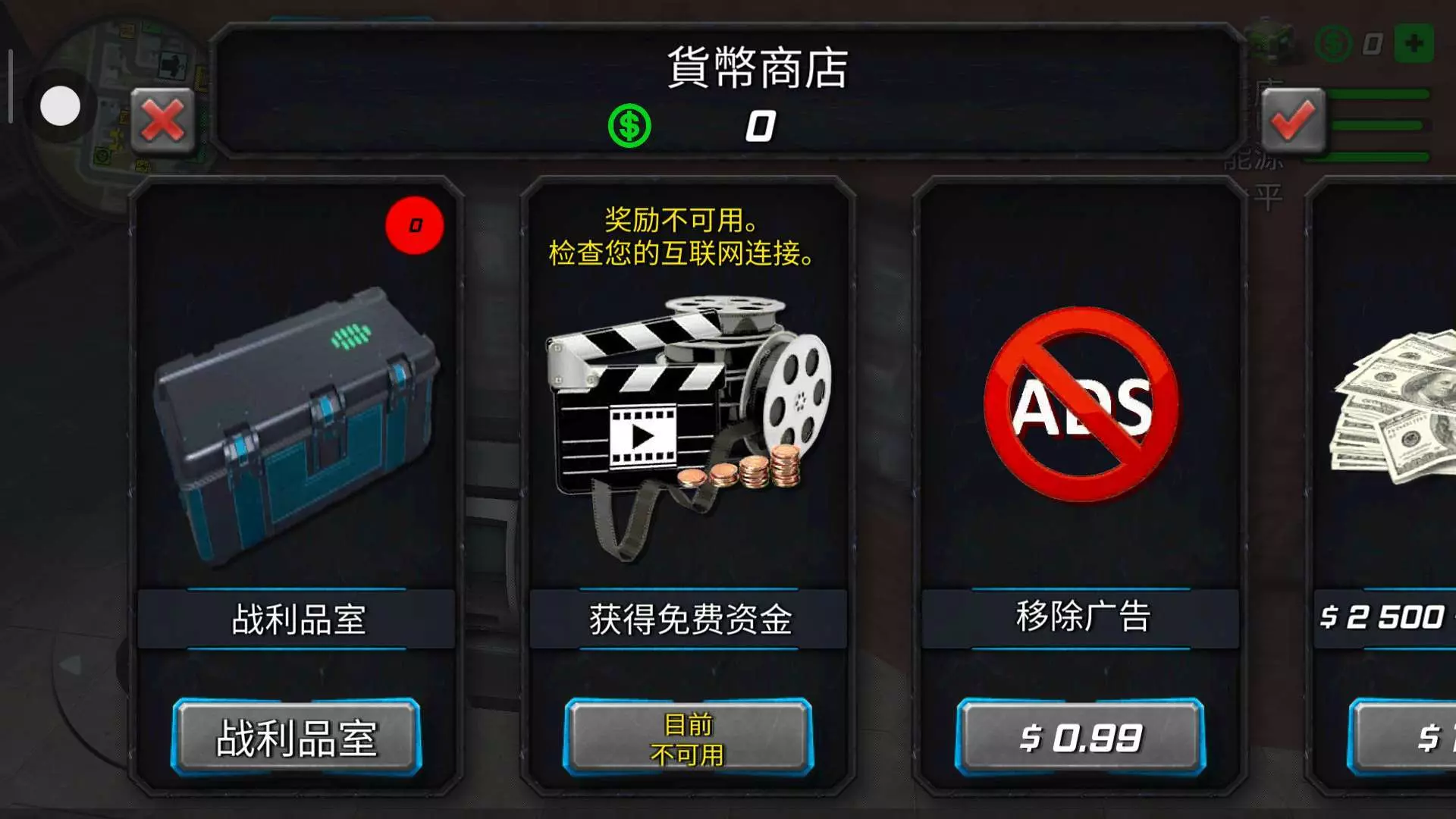 首先直接点击。钱后面的绿色加号。点击免费获得资金,前提要把网给关上。点击一下获得1000块钱。