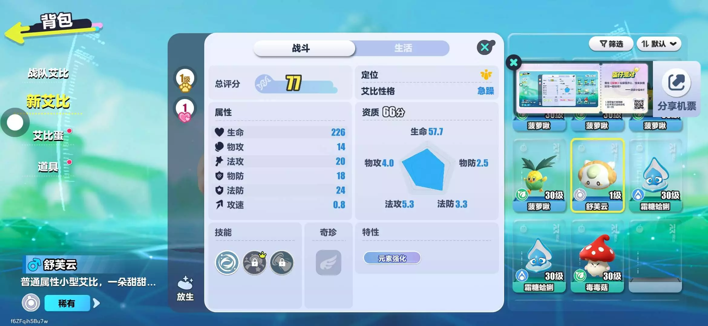 同一次探索,遇到了一只84分的蓝莓蜗领主,(可是蓝莓蜗我已经有彩光的了而且性格好)一只83分甜筒莓莓和一只80分菠萝啾