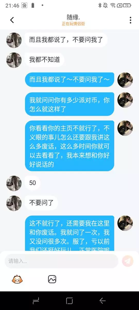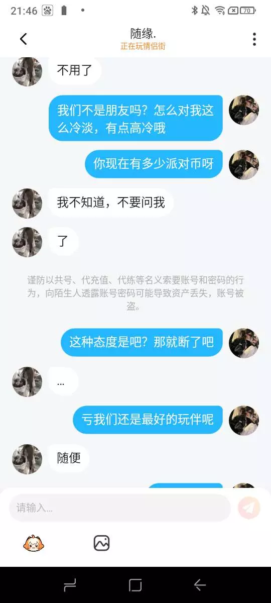 这种人不值得,本来和他玩了好久的,就一段时间不玩他就成这样了,原本我还想和他处闺,结果他就这态度,我就问他有多少派对币,他就不耐烦了,因为这种人不值得
