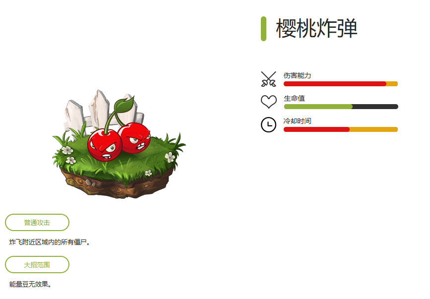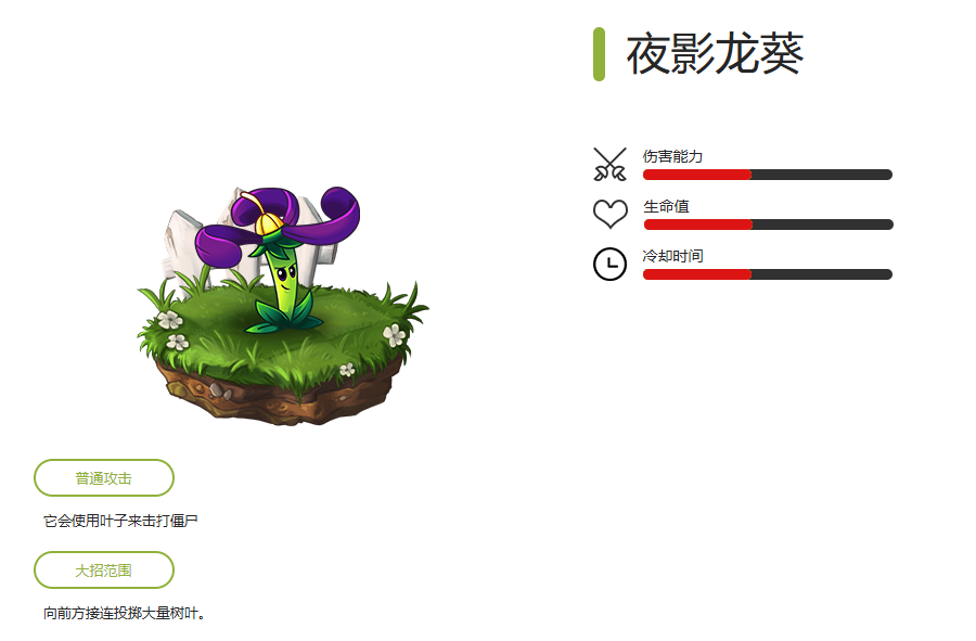 大招效果:发射五发伤害为自身攻击力10倍并造成与自身攻击力数值相同溅射伤害的豌豆。该豌豆可以被点燃,攻击力变为500*(1+植物阶数)(赤火),或是650*(1+植物阶数)(蓝火)。