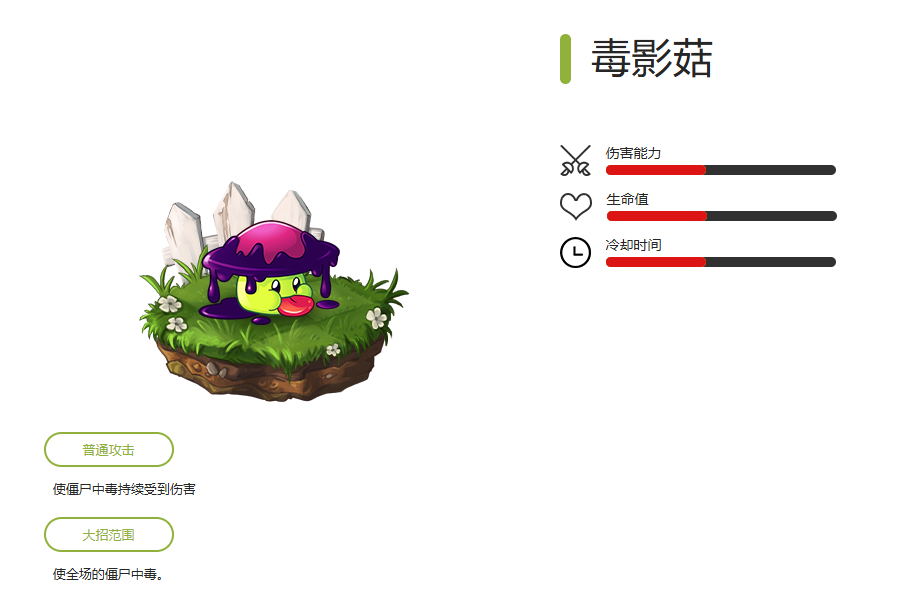 别小看毒影菇,它不仅有减速效果,还能以每秒强力的毒伤来攻击僵尸。