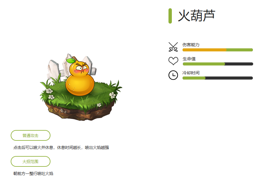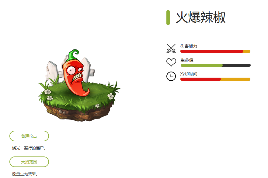 火葫芦有着高额伤害,不仅能清除武器架,还能秒杀一排僵尸,可以说是很好的白卡植物,且大招就能清除一排僵尸,合理使用能轻松过关。
