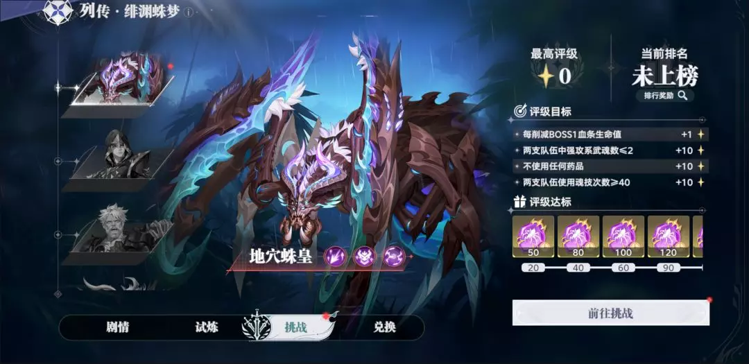 【列传·绯渊蛛梦】分为绯渊蛛梦·剧情、绯渊蛛梦·试炼和绯渊蛛梦·挑战三个部分。