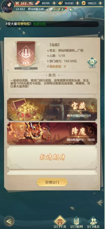 · 参与宗门活动,获得额外奖励和提升宗门等级。