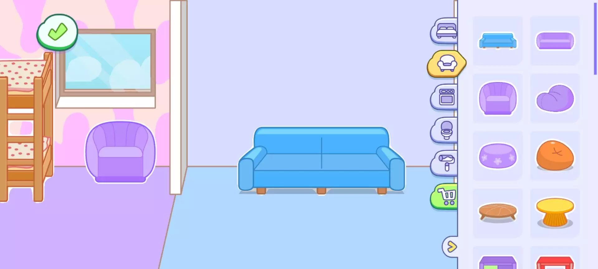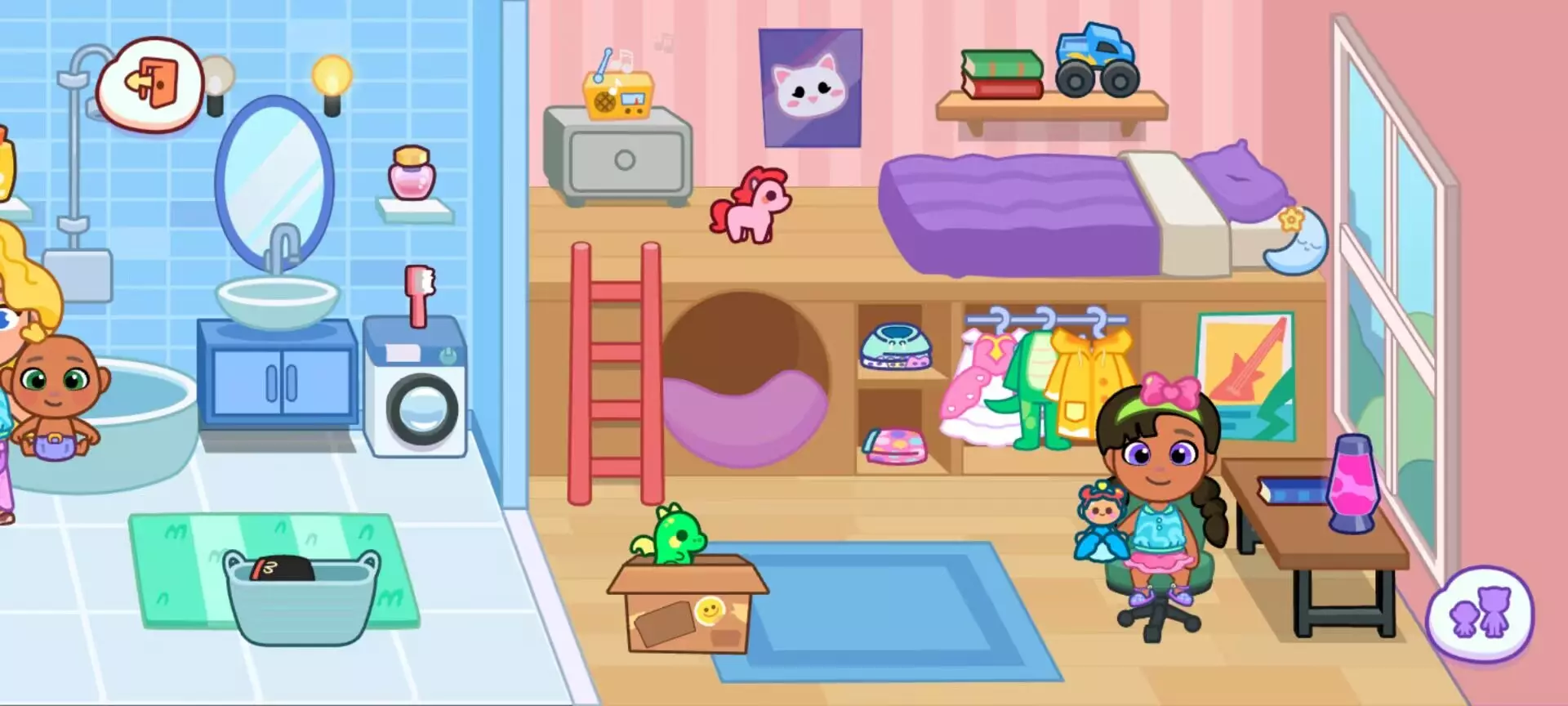 (一)卧室:私密空间的治愈时光卧室以暖色调为主,可让角色躺上柔软床铺 “睡觉”,床头小夜灯支持开关操作。书桌上的玩具箱提供积木、玩偶等道具,搭配 “播放音乐” 功能,能营造睡前故事时间的氛围。窗边的衣柜支持换装,搭配梳妆台的 “化妆” 互动(虽无实际妆容变化,但可触发角色动作反馈),适合演绎 “晨起梳妆” 的日常剧情。