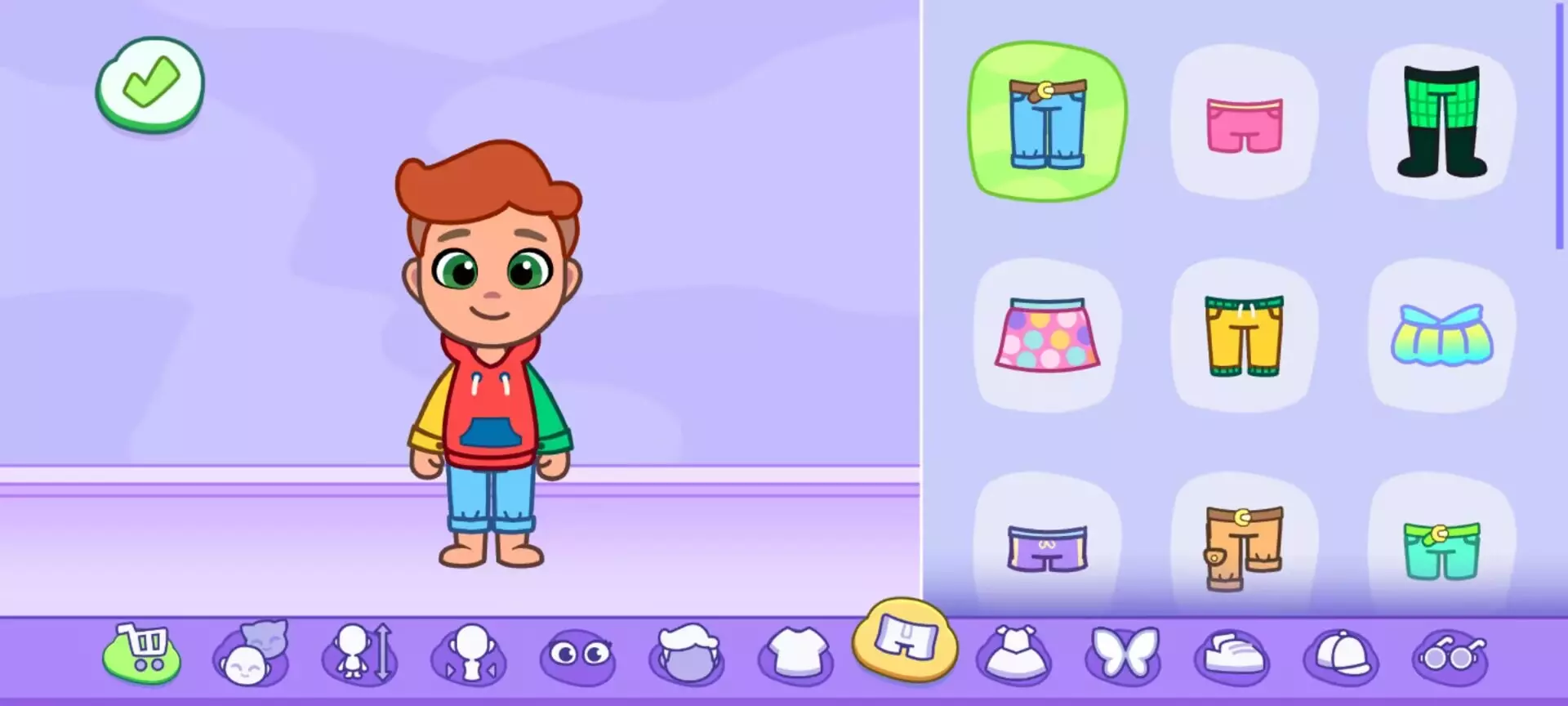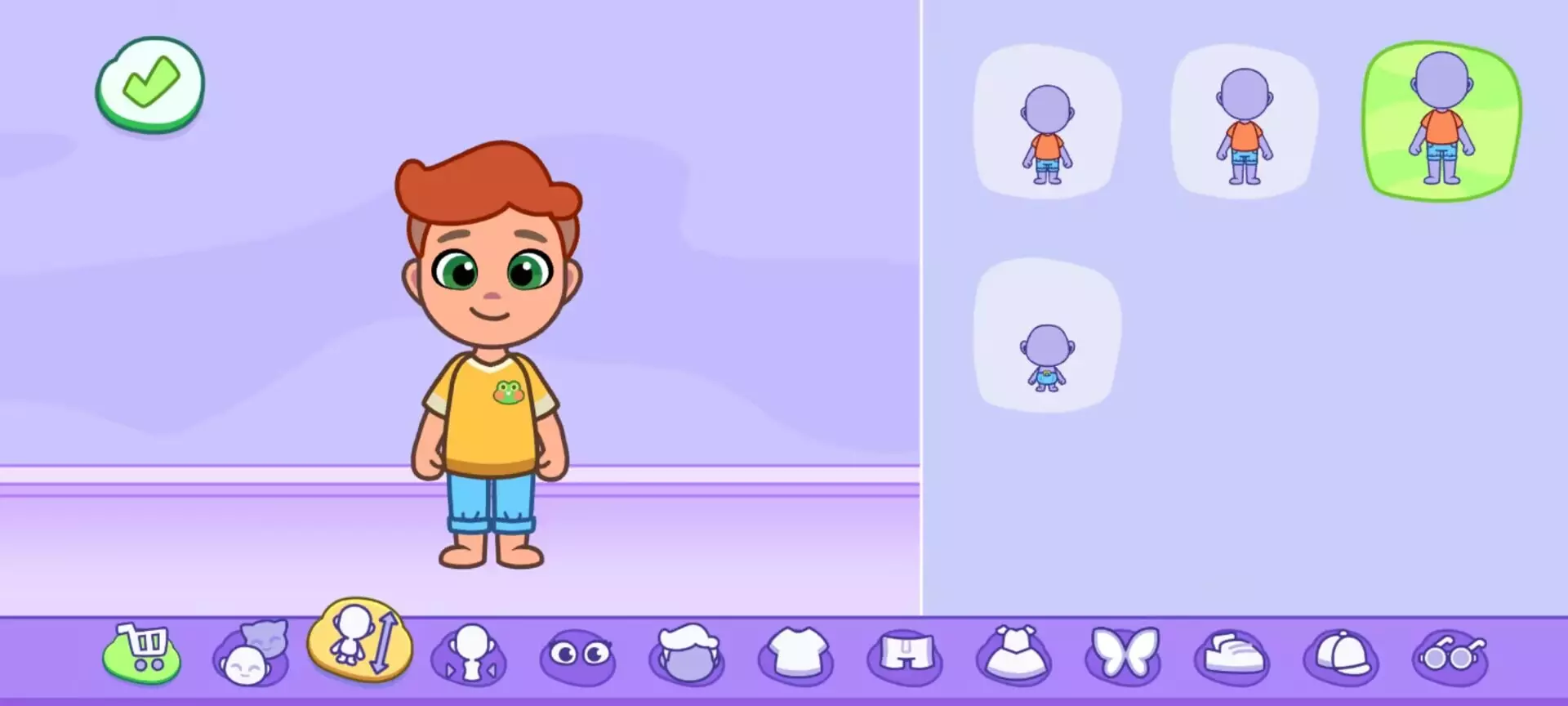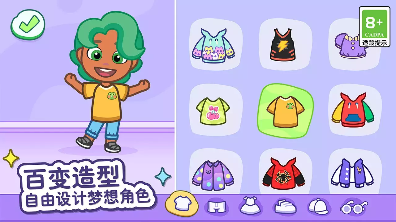 (二)个性化细节设计非婴儿角色可进一步调整体型(正常 / 苗条 / 丰满),并解锁丰富穿搭系统:51 款发型、40 件上衣、36 件下装、41 套连体衣、50 双鞋子,甚至 5 种翅膀装饰。例如,为青少年角色选择 “潮流短发 + 破洞牛仔裤 + 运动鞋”,再搭配墨镜和背包,街头风造型即刻完成。汤姆、安吉拉等经典角色虽限制编辑部位(仅发型、服装、鞋饰),但仍可通过 57 种头饰、22 种面部装饰(如眼镜、胡须)打造独特风格。