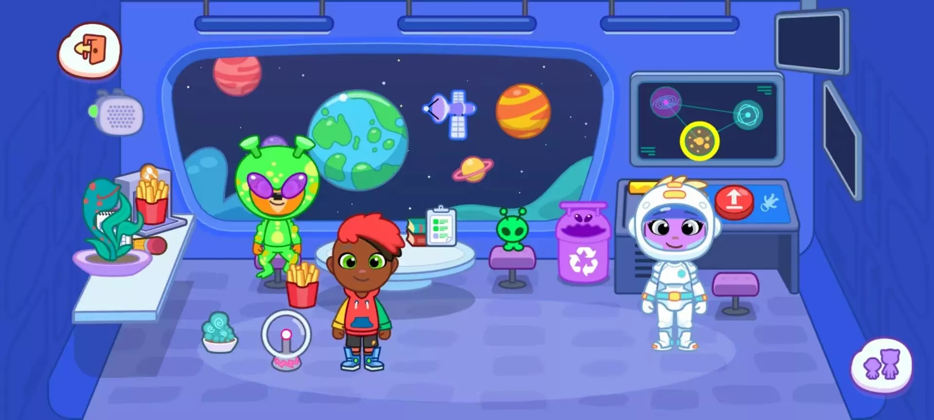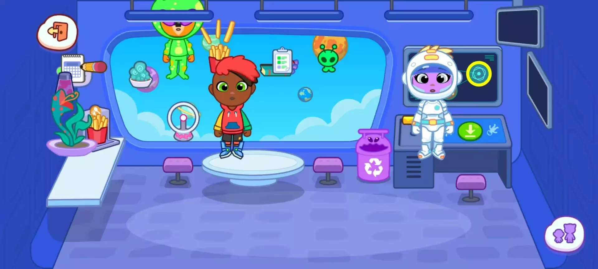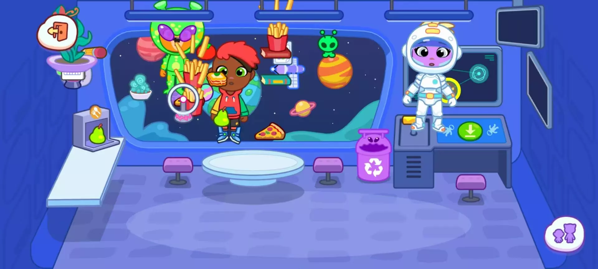 (三)太空生活模拟食物包装置可 “挤出” 凝胶状太空餐(如粉色草莓味、蓝色蓝莓味),拖给角色后会做出 “吸管吸食” 动作。收音机可接收 “外星信号”(随机音效:滴滴声、哨音),搭配控制台的 “翻译器” 按钮,仿佛在破译宇宙密码。灯光开关分为 “普通照明” 和 “星空模式”,后者会在舱壁投射银河投影,营造浪漫氛围。