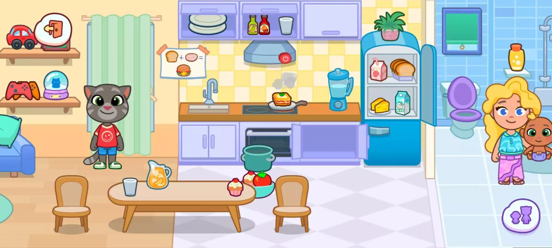 (三)厨房:烹饪与社交的中心厨房是美食爱好者的乐园。玩家可在炉灶上煎蛋、烤箱里烤蛋糕,利用冰箱食材制作三明治,甚至用搅拌机调配果汁。摆好餐桌后,拖放角色至餐椅,点击 “喂食” 按钮即可上演用餐场景。