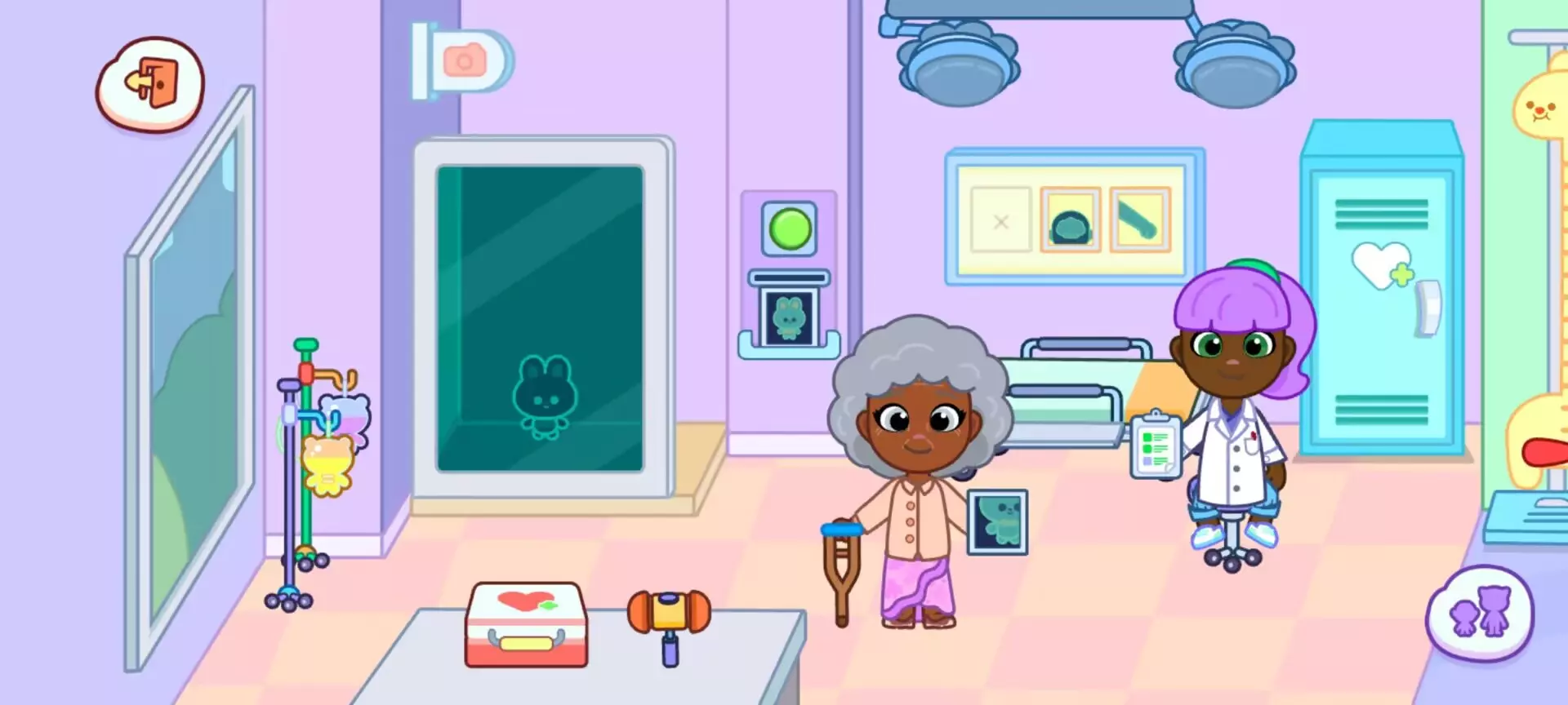 3.医院场景:扫描区给动物角色(如汉克狗)拍摄 X 光片,会显示骨头形状;给婴儿角色扫描则显示奶瓶图案。