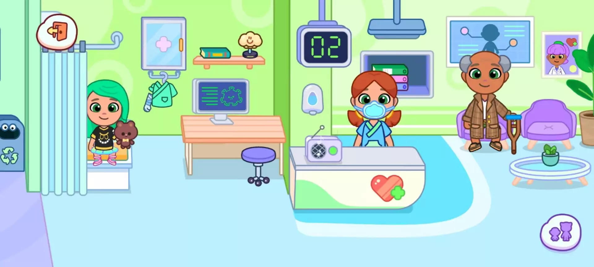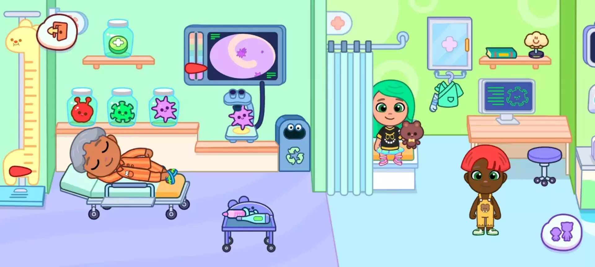 (三)诊室:专业诊疗流程体温计可 “测量体温”(屏幕显示 36.5℃-39℃随机值),电脑诊断界面有 “感冒 / 发烧 / 肚子疼” 等选项,点击后角色会做出对应治疗动作。窗帘可拉合营造私密空间,衣柜里的白大褂能让普通角色变身为医生,瞬间进入职业状态。