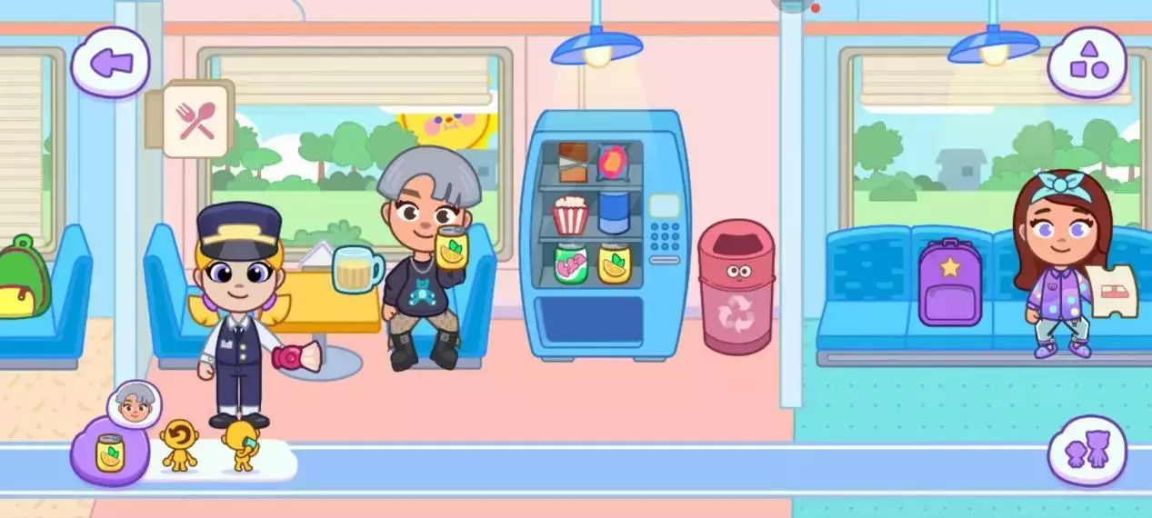 (三)座位区与用餐区:旅途中的社交座位支持 “调整靠背角度”“拉上窗帘”,行李架可 “存放 / 取出行李箱”。用餐区的橱柜提供刀叉、餐盘道具,将 “三明治”“咖啡” 摆上餐桌后,点击角色触发 “用餐对话” 动作(头部转动、手势交流)。垃圾桶可 “丢弃垃圾”(动画显示垃圾消失),培养环保意识。