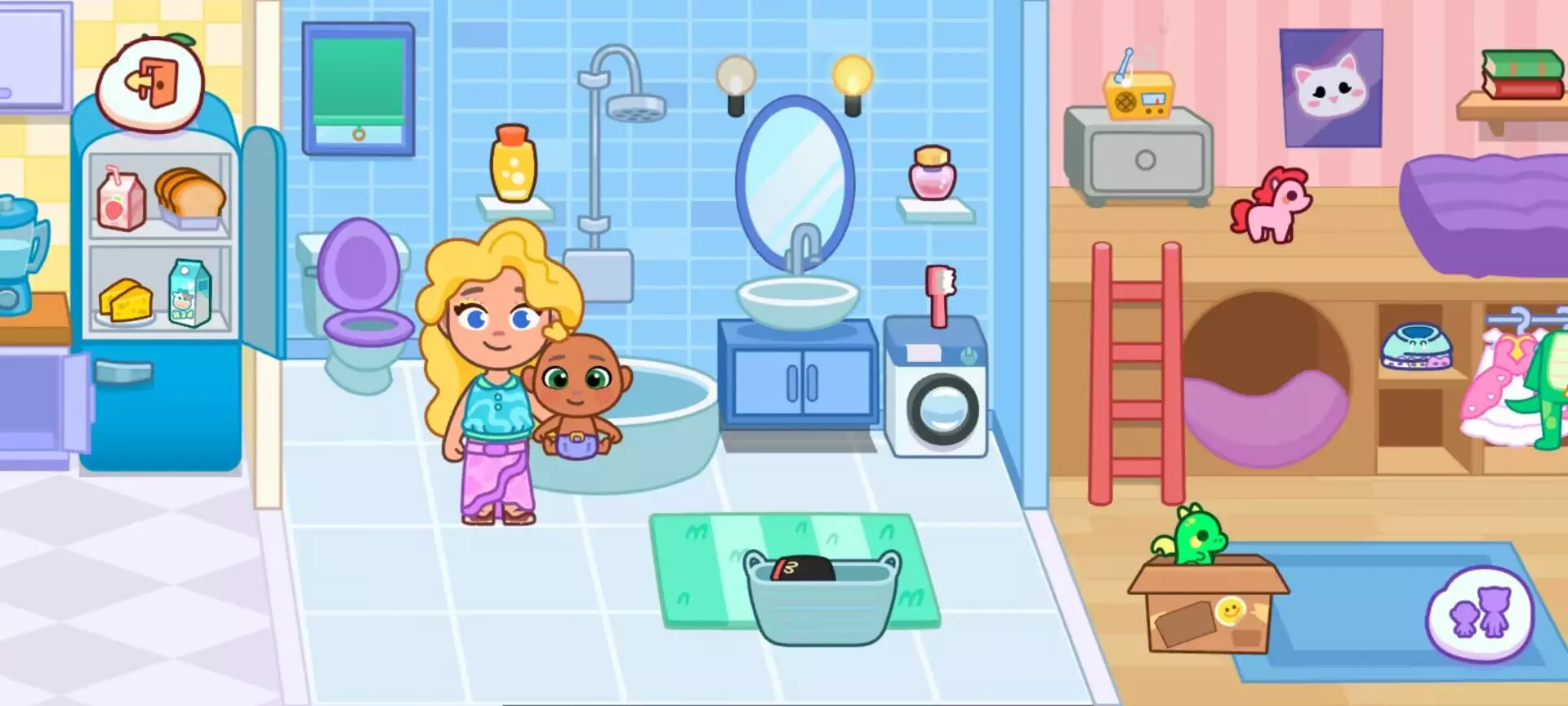 (二)浴室:趣味清洁大挑战浴室配备淋浴、浴缸、马桶、洗衣机等设施。开启淋浴喷头,洗衣机支持 “放入衣物 - 选择程序 - 晾晒” 的完整流程,完成后可将干净衣物拖回衣柜。让卫生习惯养成充满趣味。