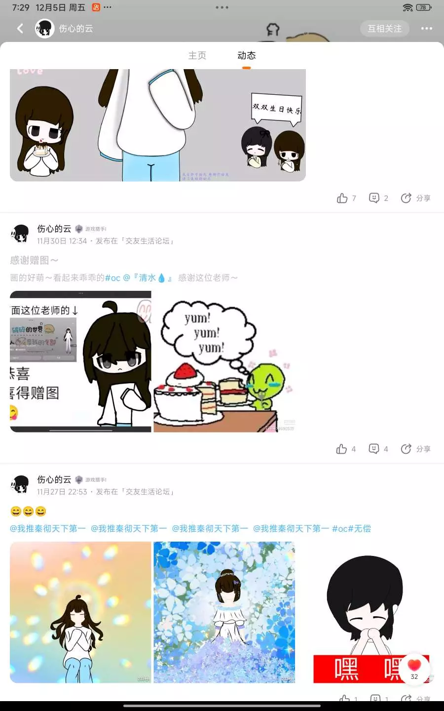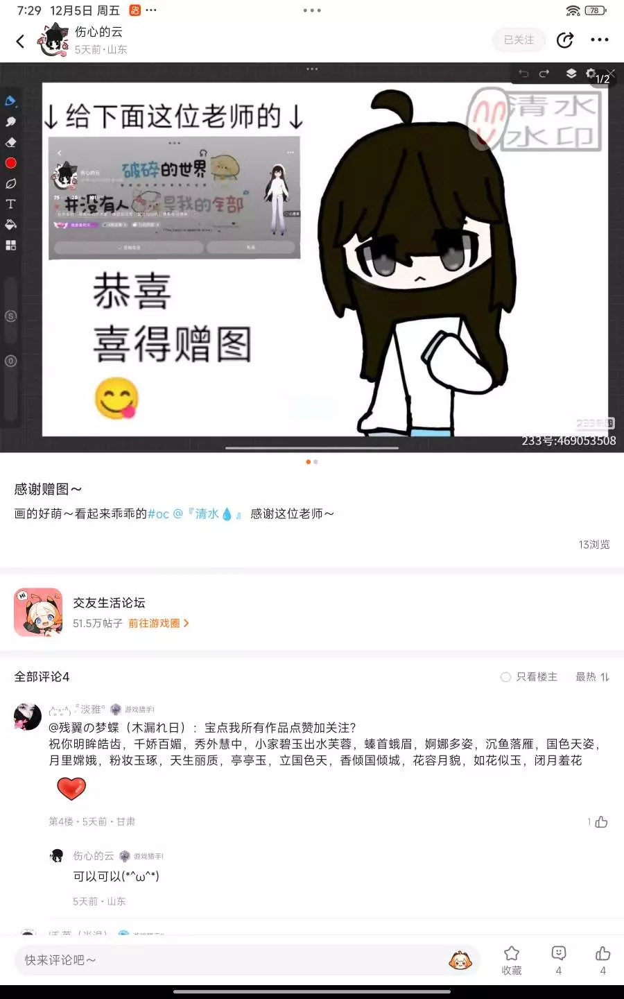 @伤心的云 很感谢这位老师把我送的赠图发了帖子!每个把我赠图发了帖子的人都会被我宣传捏~另外感谢这位老师夸奖!老师oc真的萌萌的!😍😍😍