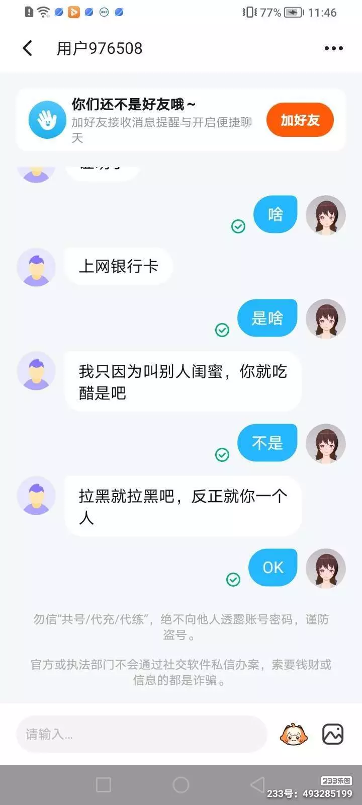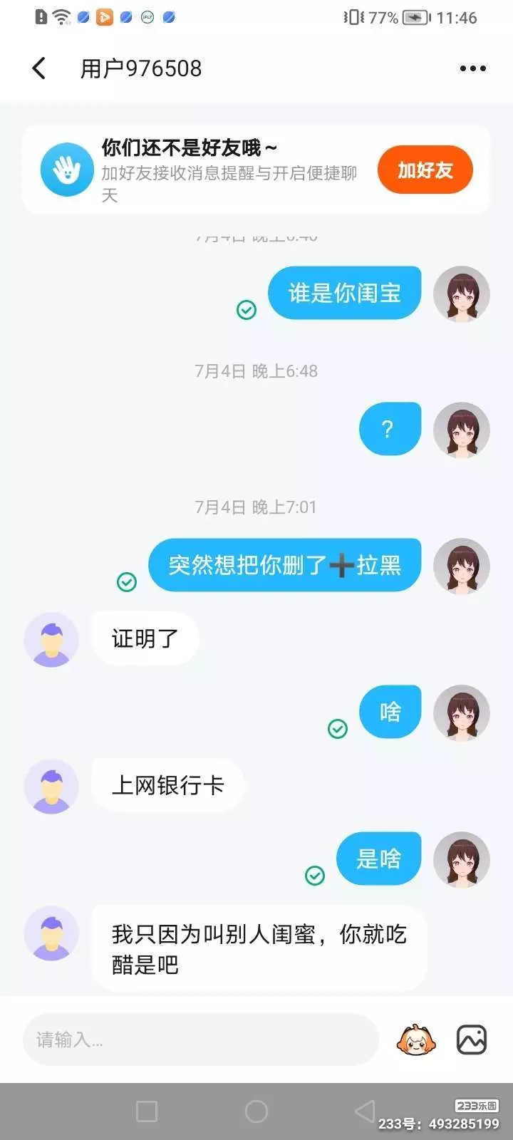 不行了,玩个游戏她说被欺负了,我去找她,她叫别人闺宝,我问她了她闺是谁(单纯想问一下)她不回我,我就想把她拉黑,她说我是不是吃醋了,我说没有,她说拉黑吧,我们就拉黑了,后来我看见她名字改成了雨妹妹(已被两个闺蜜拉黑),这就是报应吧。