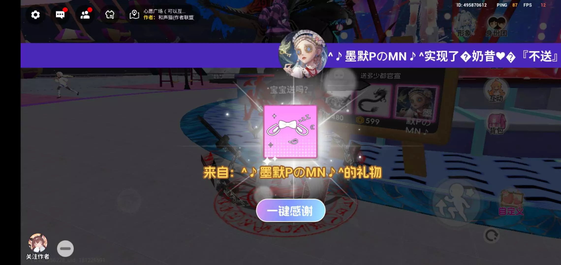 对了,顺便说一下,今天我在玩心愿广场的时候看到有人模仿了我的头像和名字,都一样,除了清团,宝子们,请问真只是巧合还是故意的呢,是故意的我该怎么办呢?是我先送了一个人发现我又送了一个人。可是我只送了一个人啊。我才发现那个名字头像跟我一样,宝子们怎么办呀