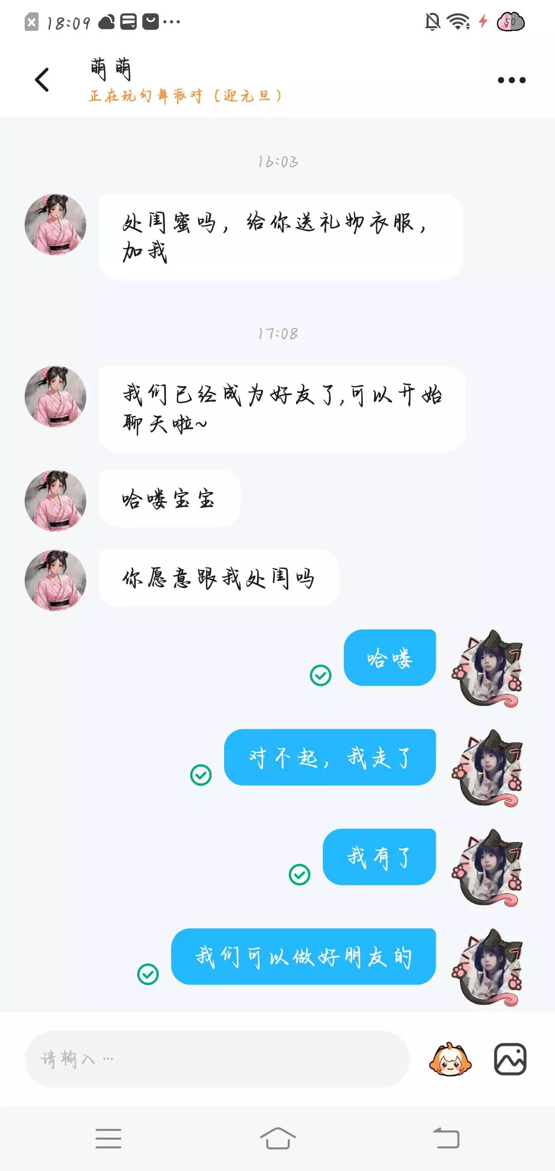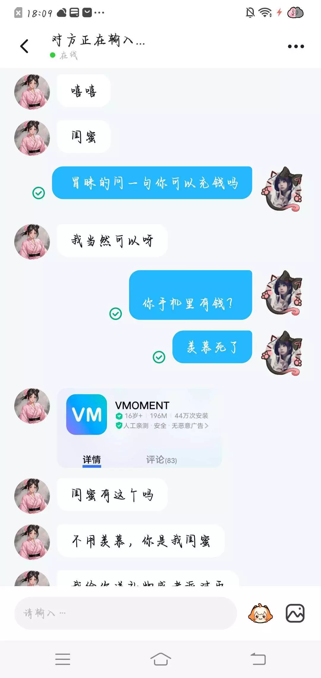 她加我好友说处闺蜜吗。处了送礼,然后我给她说我我有闺蜜了,她就说,那就做朋友吧,我说好,然后她对我的称呼就是闺蜜,然后她一直让我下载一个软件(什么软件下期更)我说我不会登录,我是测试她得,因为这个软件评论区都是说骗人的,团伙骗钱,她说是真心处就得常聊(软件是干什么的下期更)然后我说我晚上让我妈弄(测试她)她就说那就晚点再玩,我不提软件她就不理我,我想和她一起玩她就说不了,等我软件弄好,反正一直强调登录玩一定告诉她,不提软件就不和我说话,(图片没发完,破30粉更)最后另外你们关注一下我闺蜜,她是新手,什么都不懂,别去打扰她,名片在后面,她名字,衣服,怎么弄心愿单就是我教的