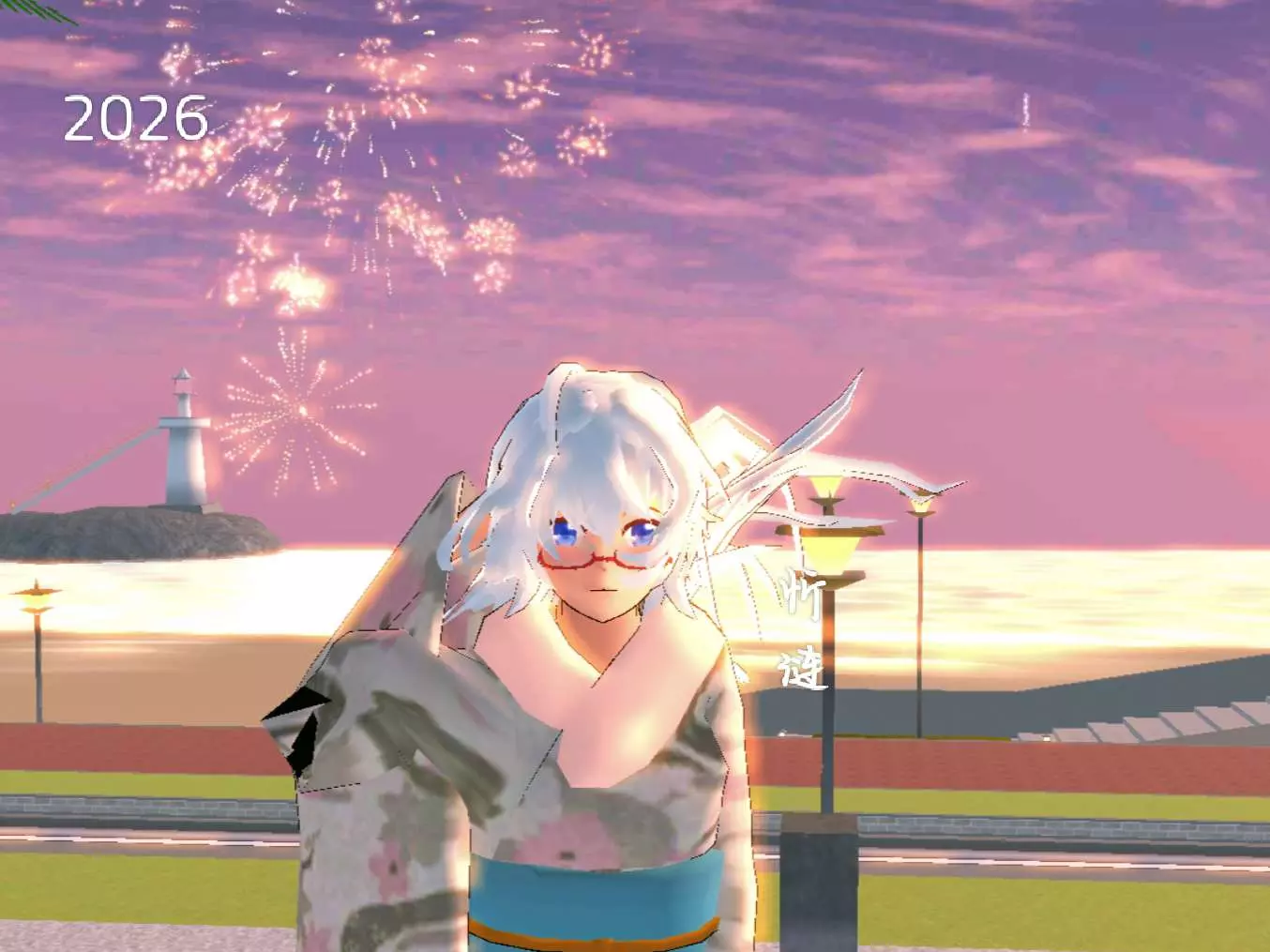 続いて、紫と藍の霞のような花火が一叢一叢、細やかな銀のきらめきを纏って炸裂する。深海で翻る蛍光の珊瑚のように、夜空全体を幽玄な青紫に染め上げる。さらに、幾つかのピンクと白の光の塊が、おじけづいたように弁の輪郭を緩やかに広げ——春の枝頭に初咲きのカイドウの花のように、星の冷たい光を帯びて、ゆっくりと墜ちていく。