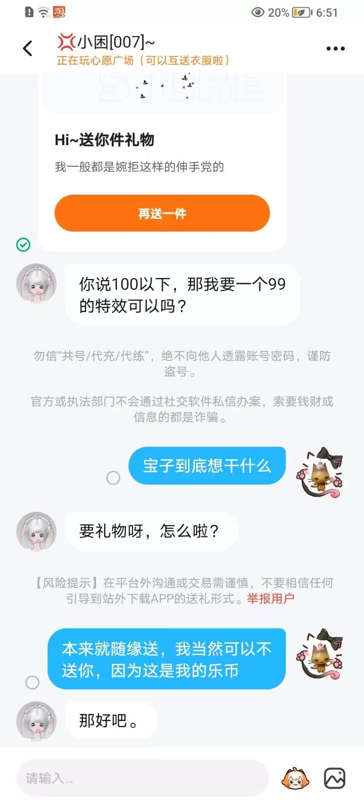 虽然说最后也是甩下一个“那好吧”这种勉强的令我不爽的语气就走了,这种三次索要的行为已经让我非常恶心(并且在心愿广场中我看到ta的发言,似乎是关于网卡ta走不了,于是直接打出别人的名字,并且让别人把ta挪到一边,语气中也没有礼貌用词而是像在直接命令别人)