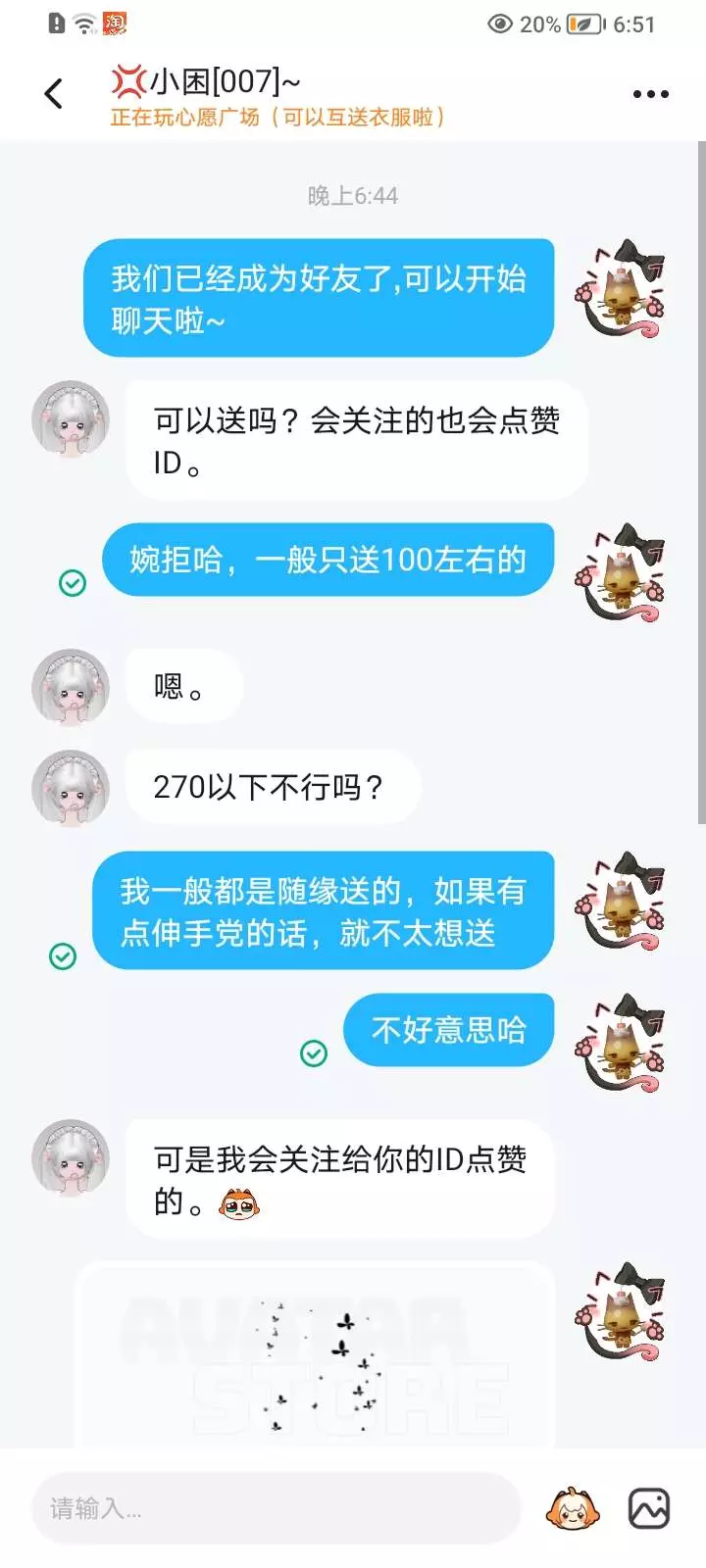 今天就遇到了一个伸手党问我要礼物,我就说明情况,我不会送给伸手党,并且我送给不认识的人的话,基本上都是100左右的。在说的很清楚的情况下,这位又过来问我能不能送270以下的。我再次拒绝之后,ta又继续索要,并且发了一个想哭的表情包,因为玩233乐园大多是小孩,我想着ta可能也就是一个小孩很想要自己喜欢的东西而已,于是觉得这么婉拒ta或许有点不太合适,于是就去ta心愿单里逛了一下,发现有几个便宜的,于是就送了一个。
