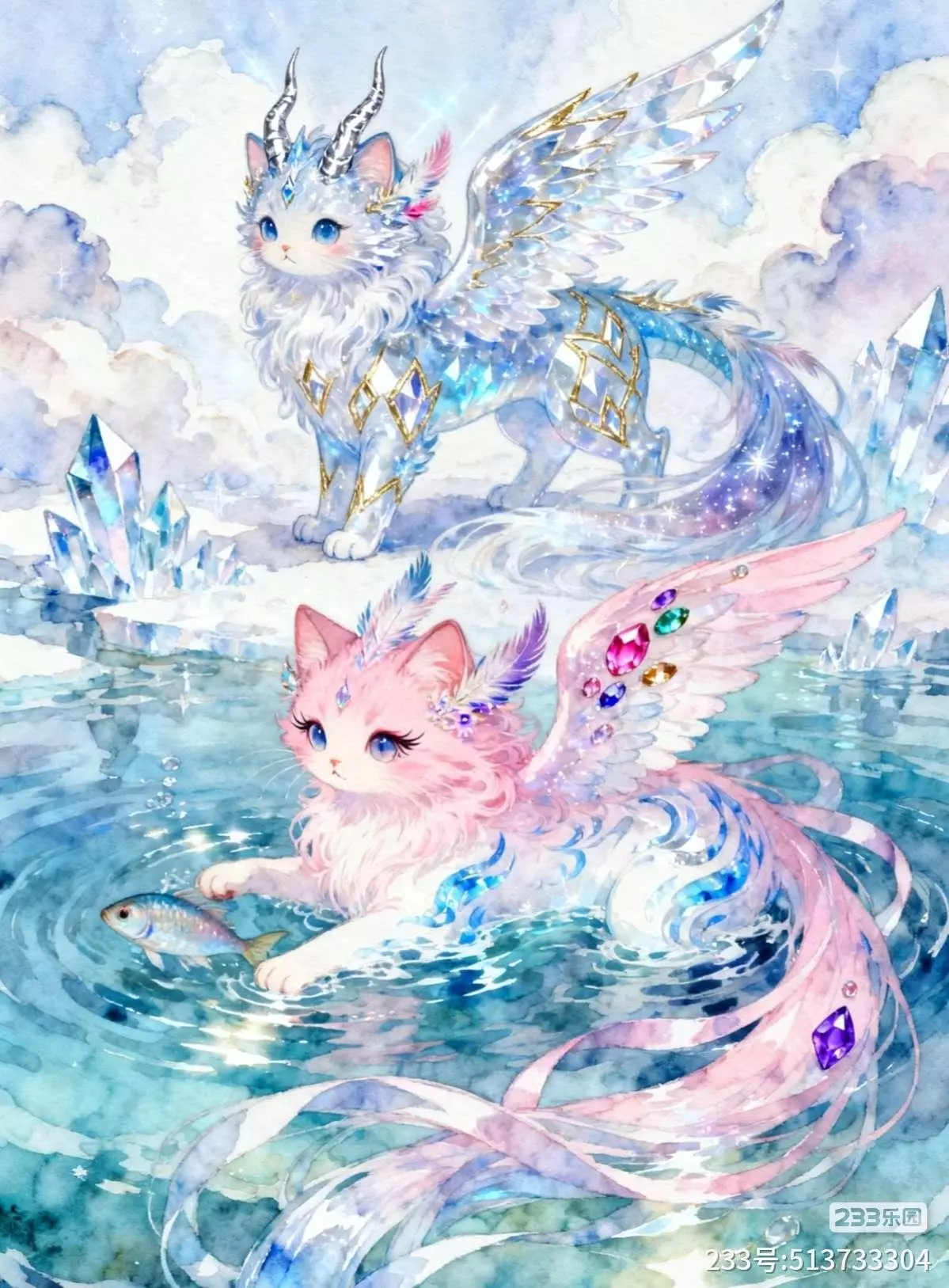 画面中,古色古香的亭台楼阁矗立在清澈见底的小溪旁,溪水静静地流淌,仿佛时间在这里也变得缓慢。水面上漂浮着荷花,粉嫩的花瓣随风轻摆,岸边的垂柳依依,柳枝轻拂水面,如同诗画中的柔情。