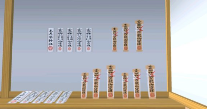 NO.11 木天蓼神社社务所中的神社少女她的名字就是神社少女,没有其他名字。【特殊情报1:该NPC无法使用物品攻略,因为她不符合数据保存条件】台上木牌的字是【御祈願受付】,意思大概是【神祈祷前台】?因为在日本的御的意思是[收],而受付的意思是[对申请、诉讼、请愿等的受理;对来访人员或参加人员进行接待的场所;对来访人员或参加人员进行接待的人员。问讯处,接待処。一般用来称前台,接受,处理。传达室,收发室 但是通常翻译成登记问讯处、前台],所以也有可能是【受理祈祷】和【祈祷受理】的意思?(P2)她背后的墙上和桌上摆放着很多符,从左到右从P3到P6以此翻译就是【木天蓼神社】【木天蓼神社家居安全守护符】【木天蓼神社交通安全守护符】【木天蓼神社消灾守护符】【木天蓼神社世界和平守护符】。木签是【木天蓼神社万能守护符】,放在桌上的白签内容和上方相同。(P3.P4)……应该是守护符吧?找[御守護]的翻译也就只能找到关于守护的内容,所以就这么翻译吧?以及日本的[家内]是[家庭、家居]的意思,为了流畅性这里选了家居这个翻译。大号木板上的字翻译【地球滅亡】【人类滅亡】【幸灾乐祸】【人的不幸】【独占利益】【国家安泰】【世界和平】【商业兴旺】【无病无灾】【学业有成】【交通安全】【家居安全】【消灾】,最后那两个字是【愿望种类】。(P5)木板下放着的是各种颜色的御守和写着【木天蓼神社】的上签,虽然有那么多能卖的东西,但神社少女只会售卖三种祝福。(P6)【特殊情报2:该NPC不会和角色打招呼,且其服装与角色的巫女服有众多不同,目测是巫女服初设】(P7)无论男主女主小孩子们还是猫管家,和她的状态都是【其他人】,对猫管家不会表现出惊讶或特殊台词,臂腿智力都是1,生命值为100。因为是特殊角色所以靠拥抱和赞美与她成为恋人[因为亲了一下和拥抱的缘故,心情值为8]后,向她[给我点儿钱],钱数为[42],大概是因为神社基本没有人来的缘故。不会回家,只待在神社里。【特殊情报3:在社务所的角落里有一个纳札所,作用是摆放民众交回的过期神社神物道具,例如超过一年开始失效的御守。】(P8)【特殊台词[购买物品]:我们很高兴你来祷告】倒地后无特殊台词。【木天蓼神社售卖物品测试记录】:1000元的魅力(增加回复量),购买该祝福后前往医院,躺在病床上时的回血量速度加快,并且进食食物的回血量增多,例如原本只能回30血的奶油蛋糕在购买符咒后便可以回60血。1000元的魅力(伤害降低),敌人对角色的伤害降低(11变3),自己对敌人的伤害不会降低,好使到爆。1000元的魅力(增加人气),这个经过测试,发现使用后与未使用时与人交流增加的人气一致,因此目前还未发现该物品有什么其他作用。