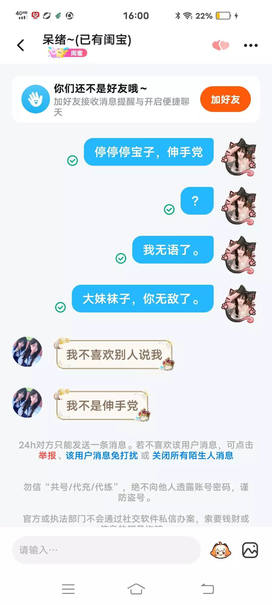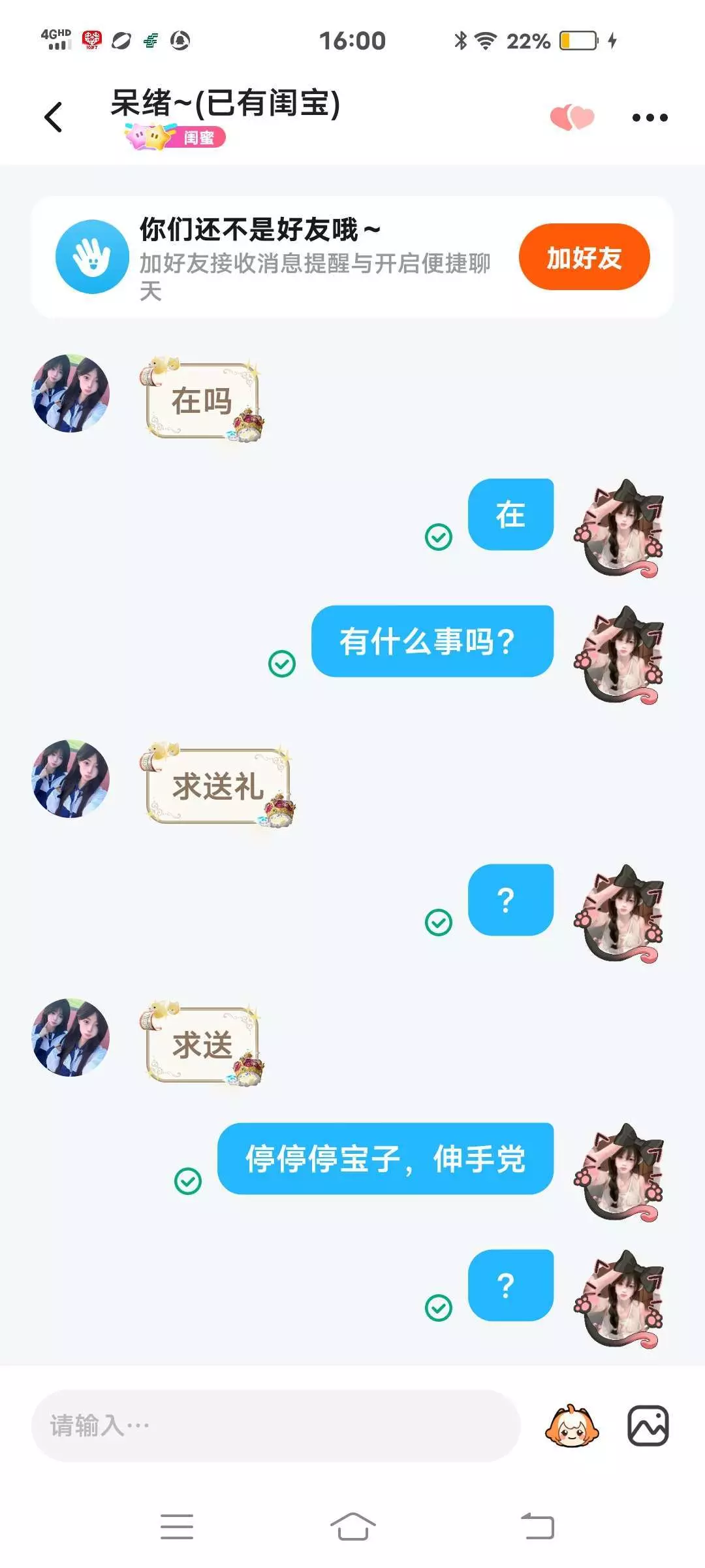 问我在吗?然后我回了在又问我要礼物,我说什么?我最讨厌伸手党了,然后他就让我送他礼物,我原本已经准备当没看到过,再给他一次机会,他又让我送礼物。大妹袜子牛逼了,然后他又让我别这么说他。他不就是伸手党吗?无语了,还把我拉黑了