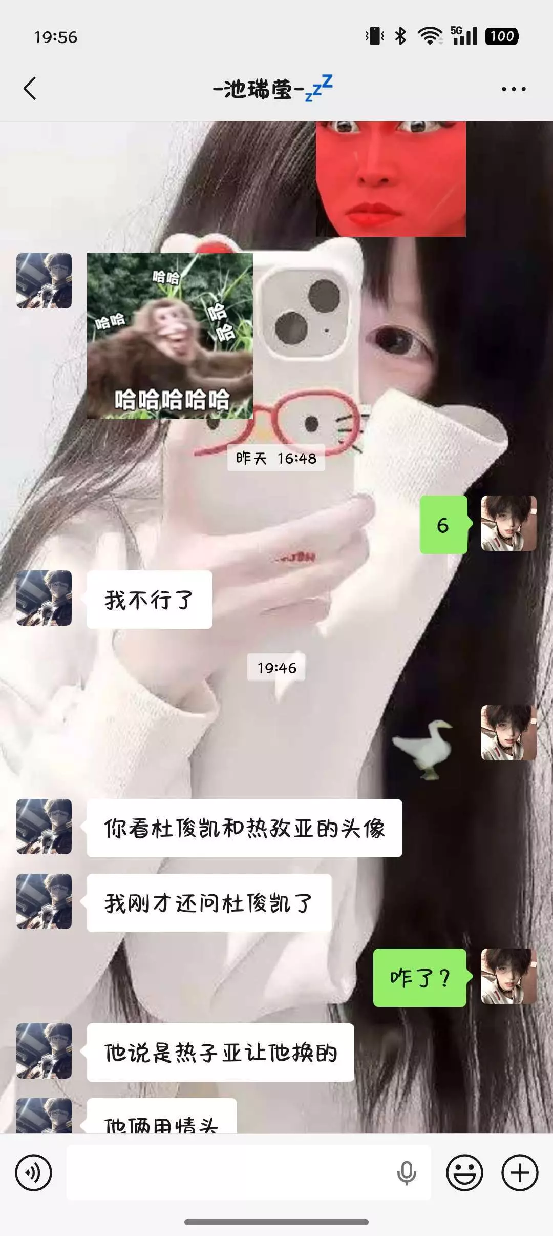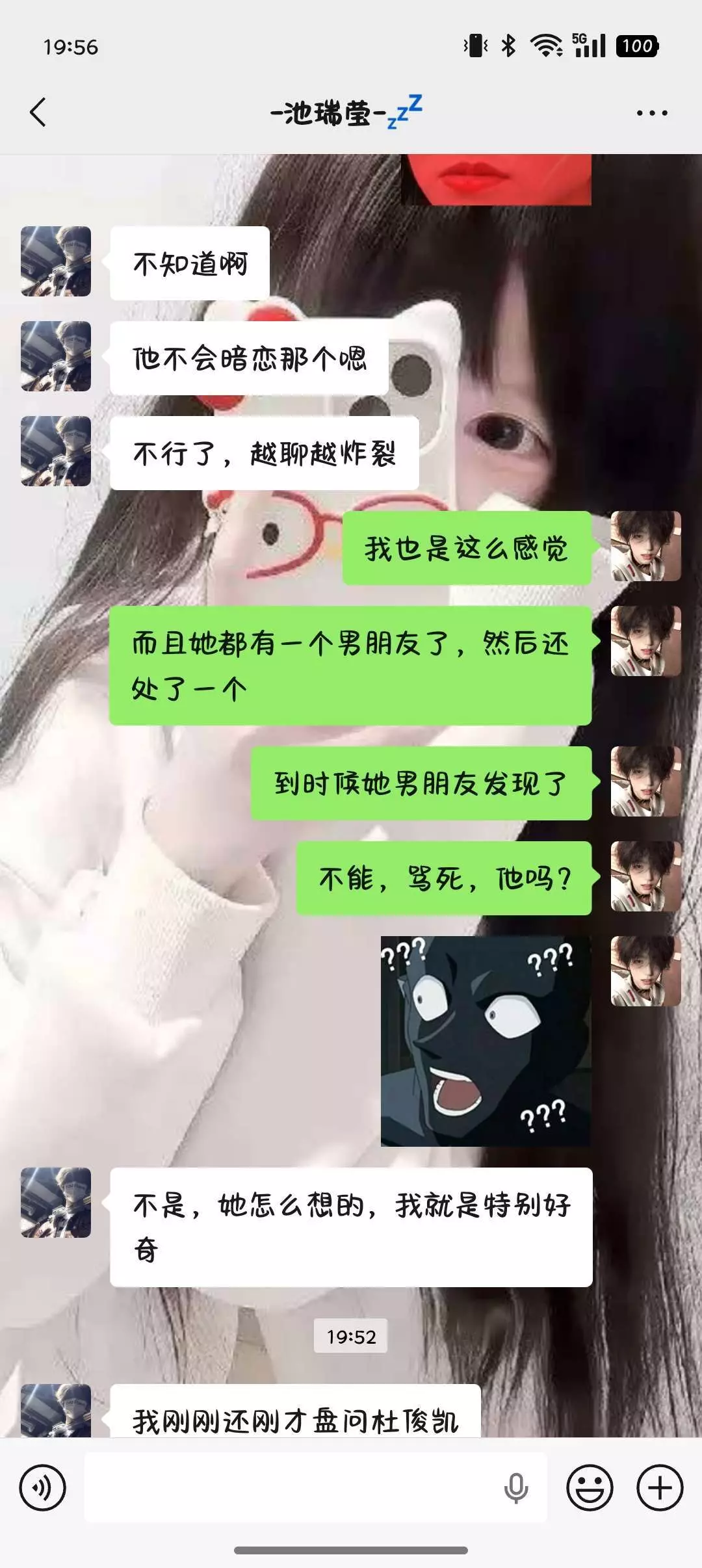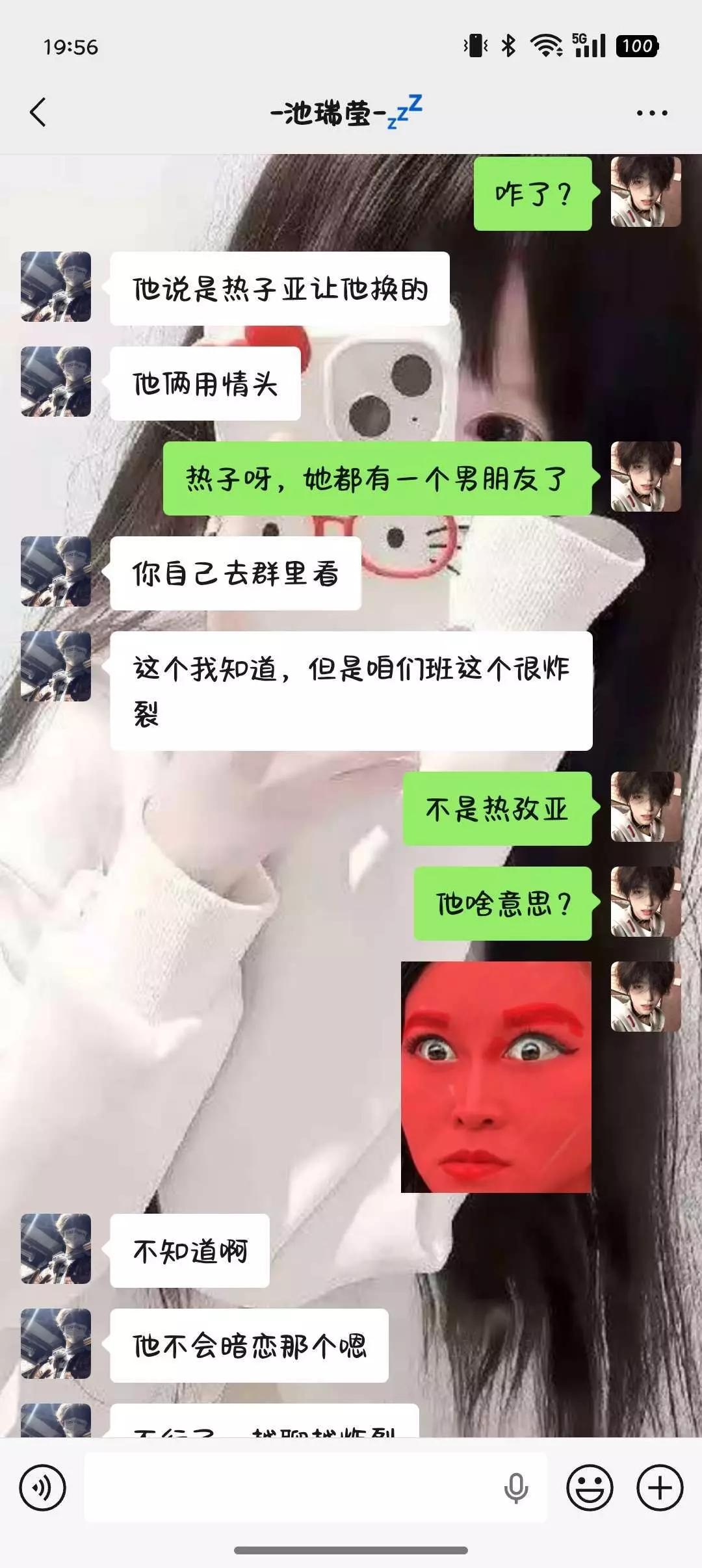就是我们班有个女然后呢他有一个对象了,然后呢我们班还有个男同学,他的那个头像呢跟我是那个女同学让他换的。炸裂的是还是情头我真的受不了了