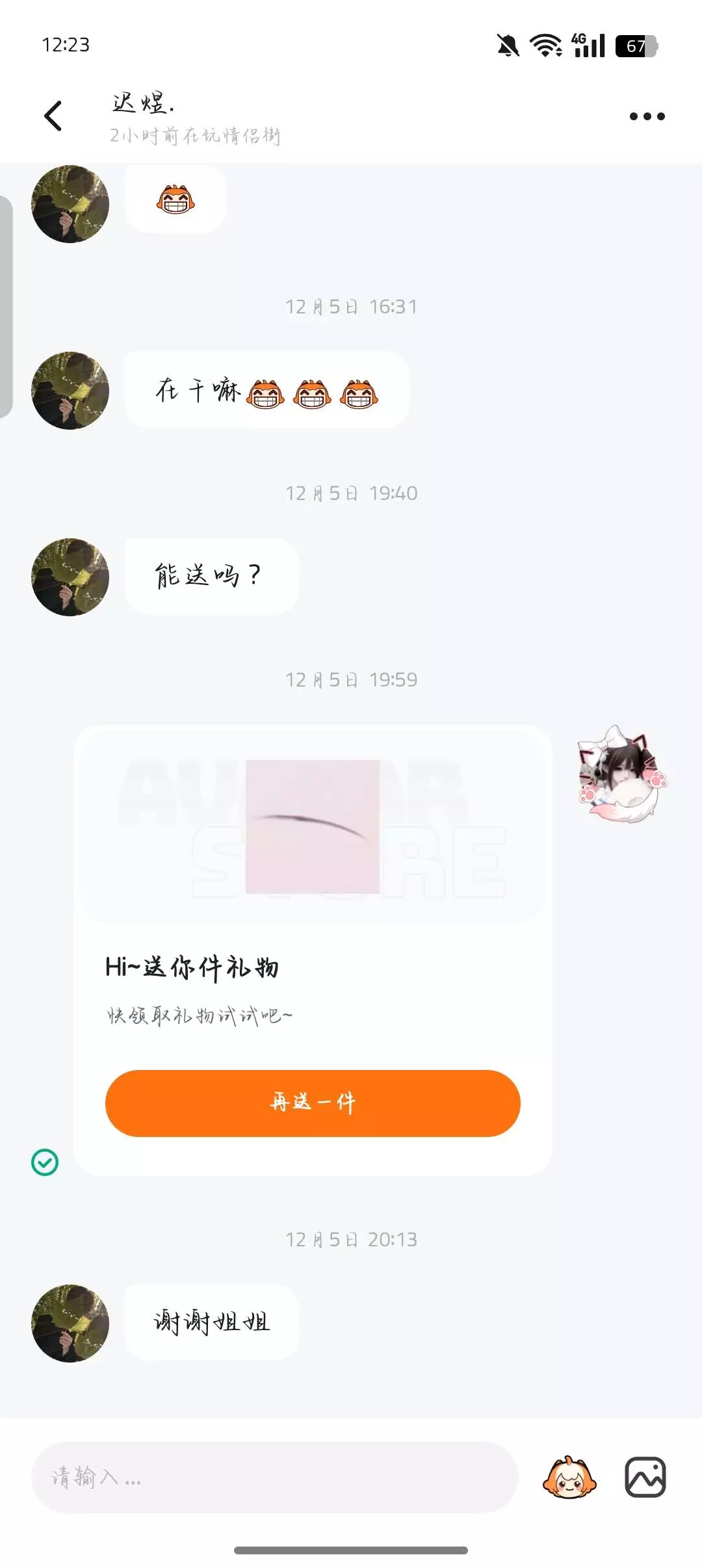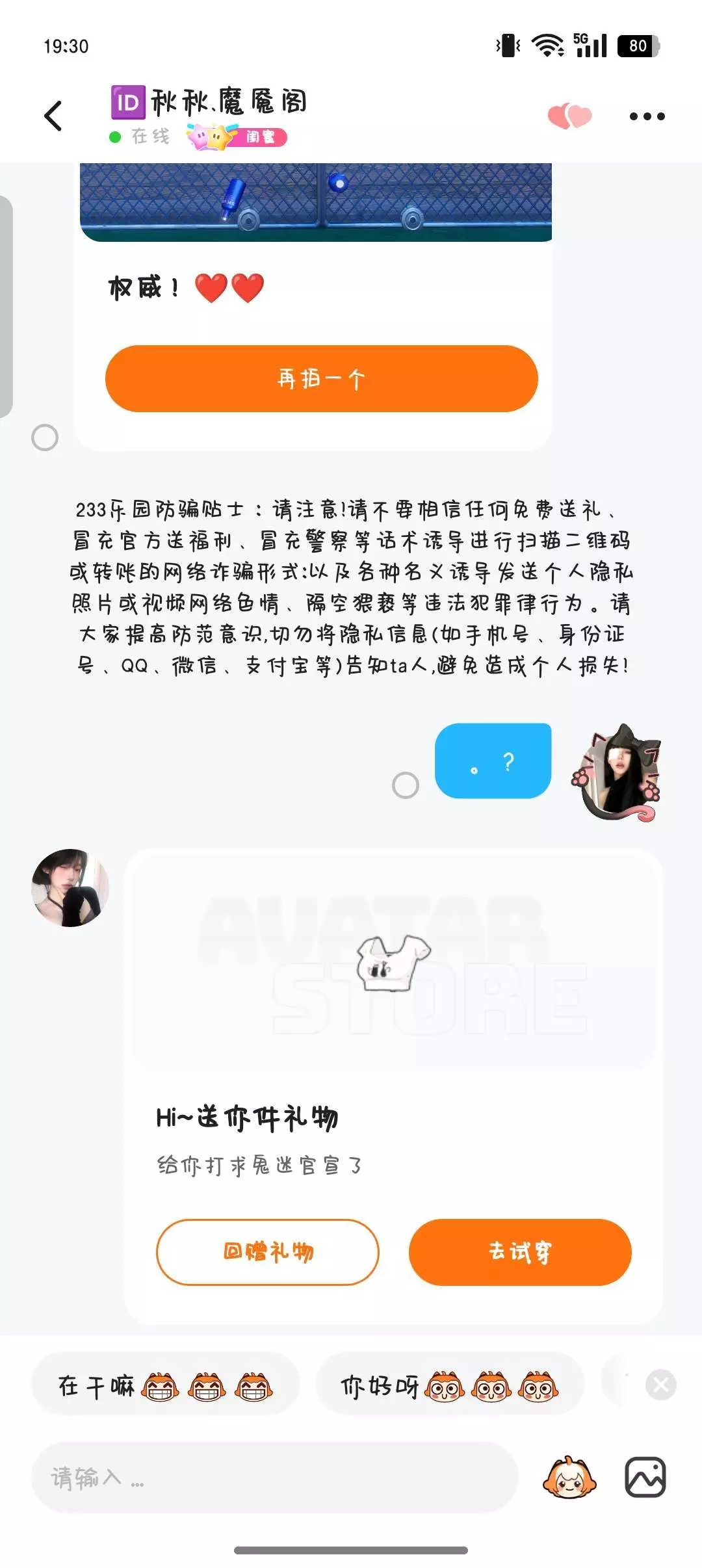 和我一起玩可以,我有两个闺蜜了一个对象。但是如果你是为了想让别人送你礼物的话,那还是算了吧。