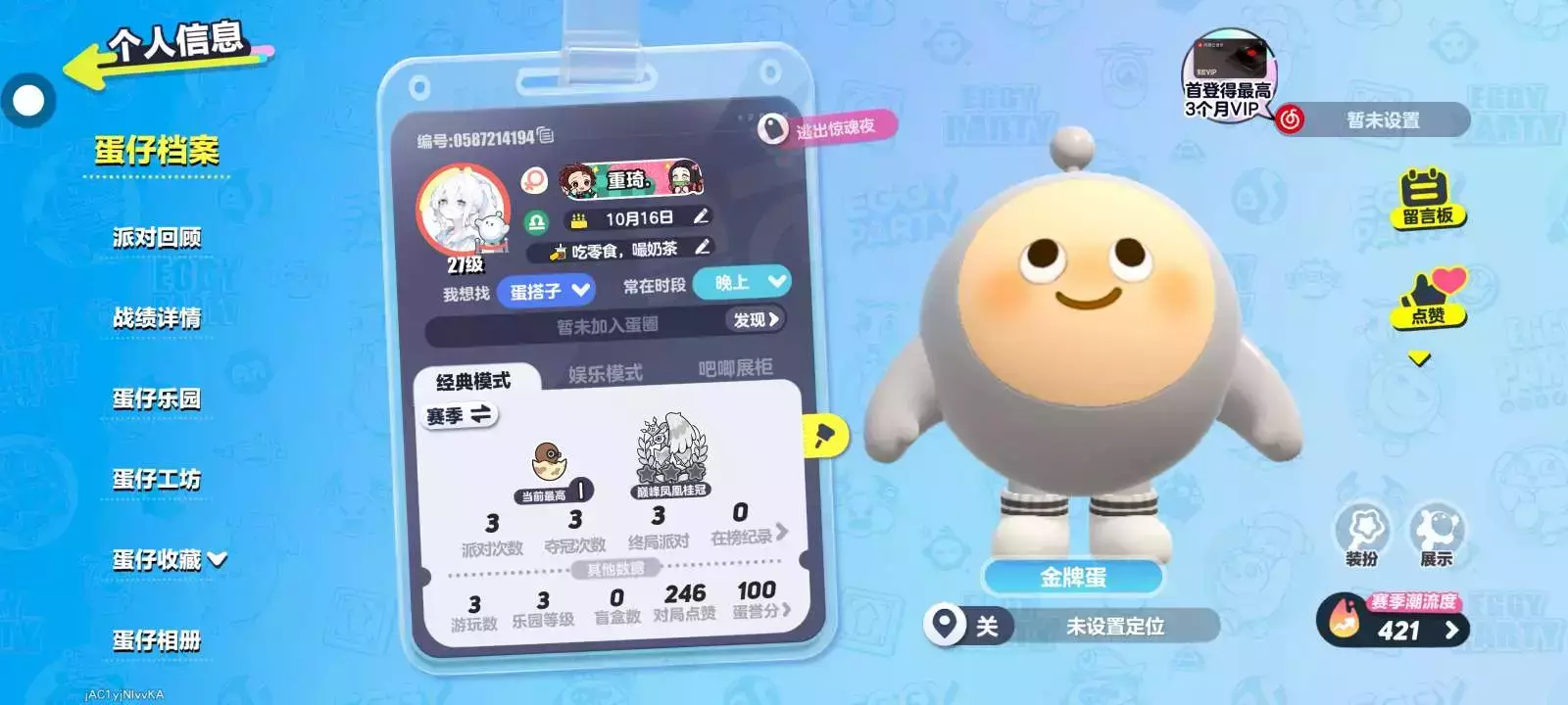 新开了一个号。旧号丢了,我也忘了闺蜜的蛋仔名。只记得叫刹什么。希望看到后能回复。 其他宝子来找我玩也行。玩逃出惊魂夜。新号有点菜。大号叫温妤好酸。还有一个号叫诸暨女皇。😚 新号刚玩一周,别嫌弃。现在已经找到了想加好友的自己加就行不用特意和我说。