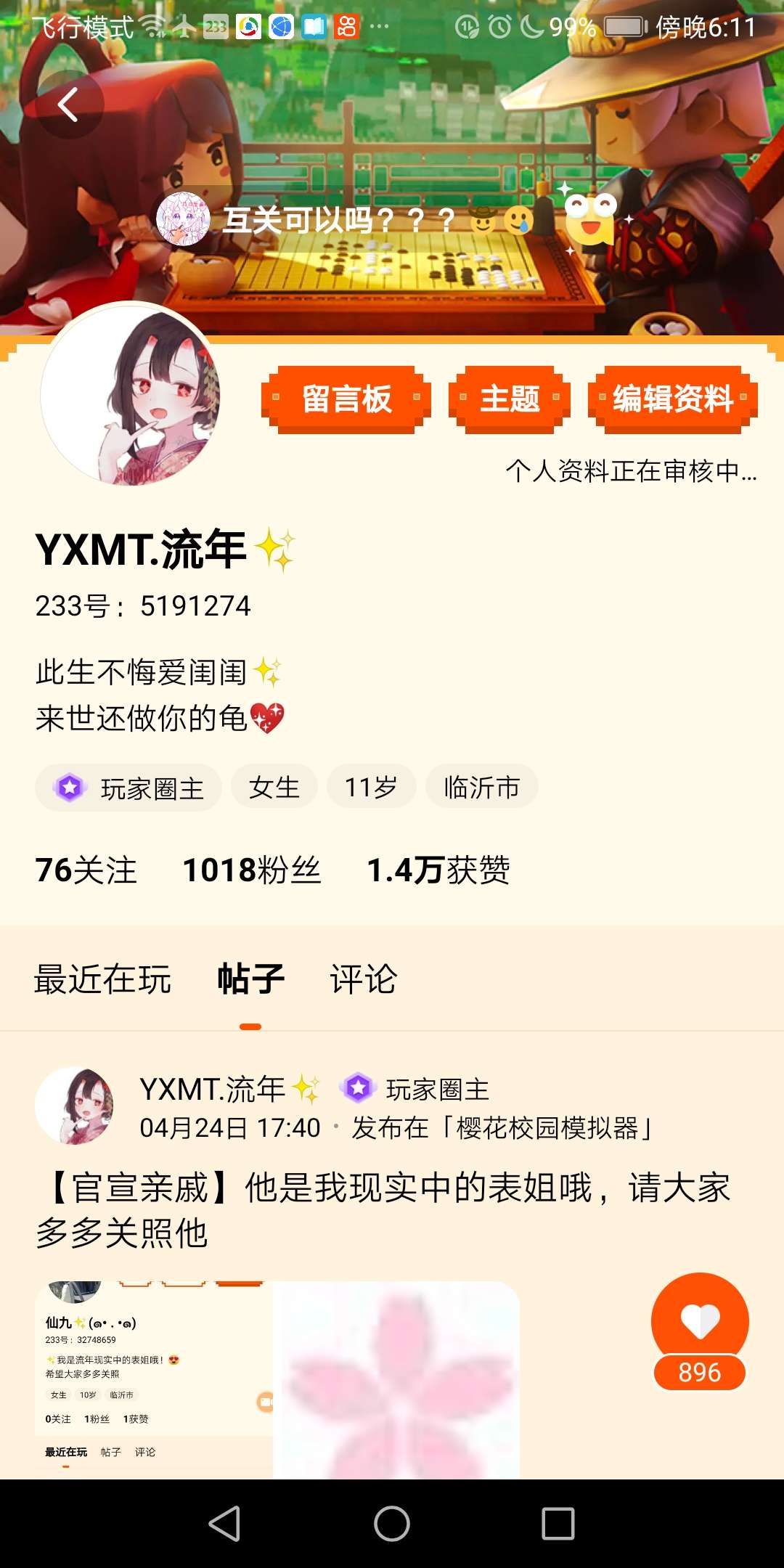 她刚来没多久,我帮他登的号,他很喜欢玩樱校,希望以后他能和大家和睦相处