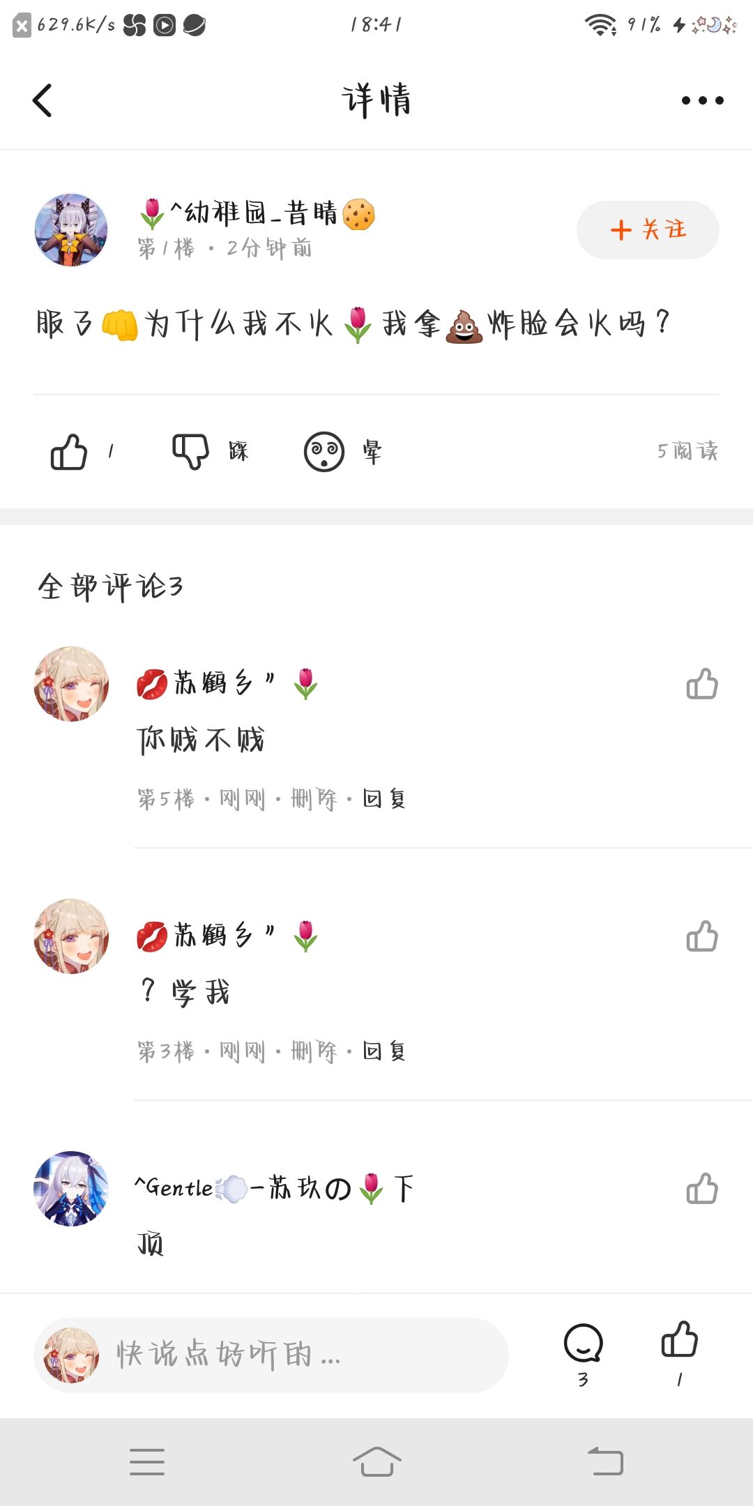 姐素质就是不好你管得着?在那装什么楚楚可怜私信不是很牛逼一口一句粗话吗?我说起来还着急光发我说你你也不看你上面说了什么笑死😘