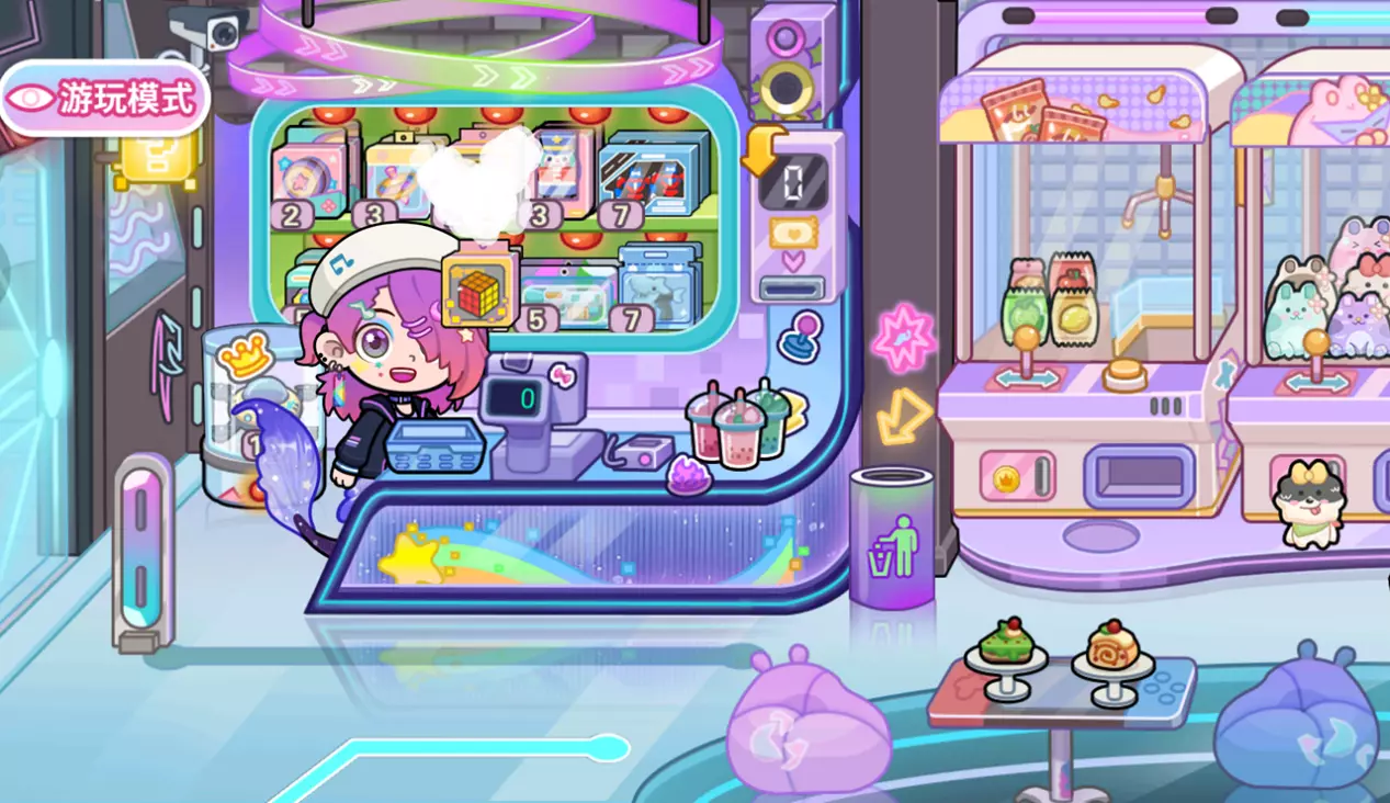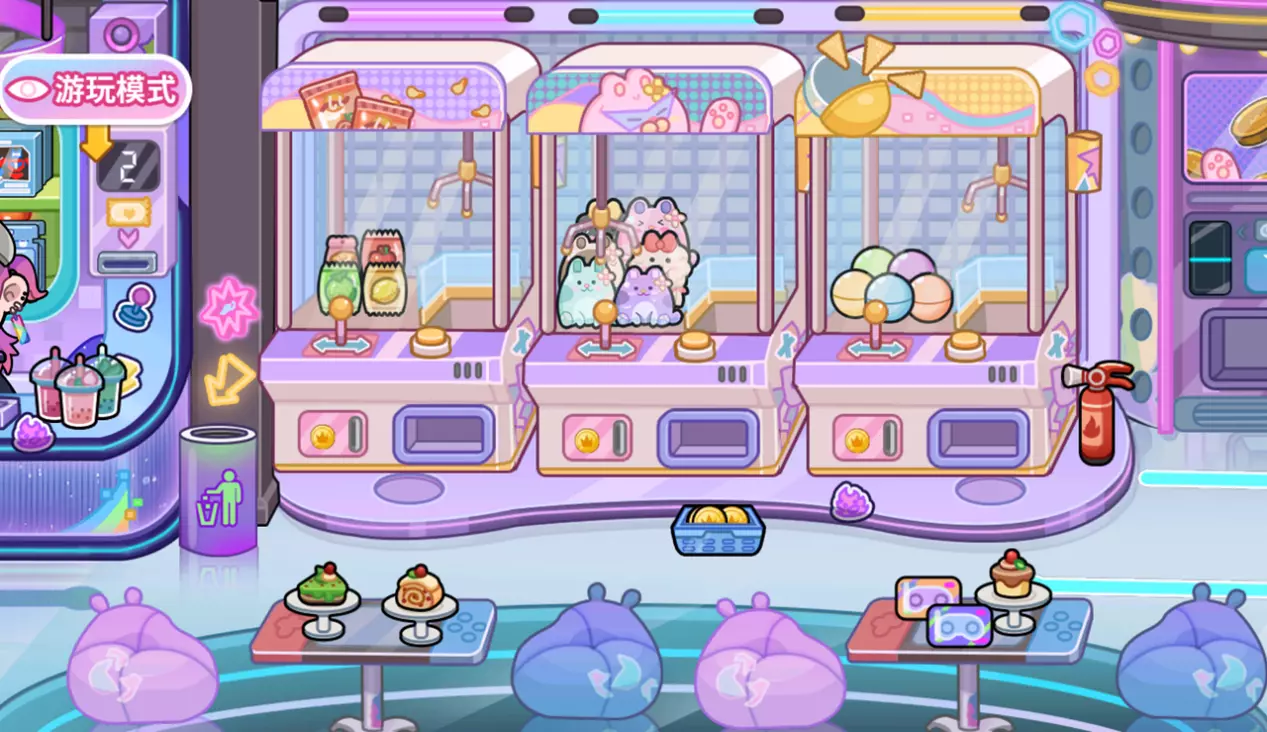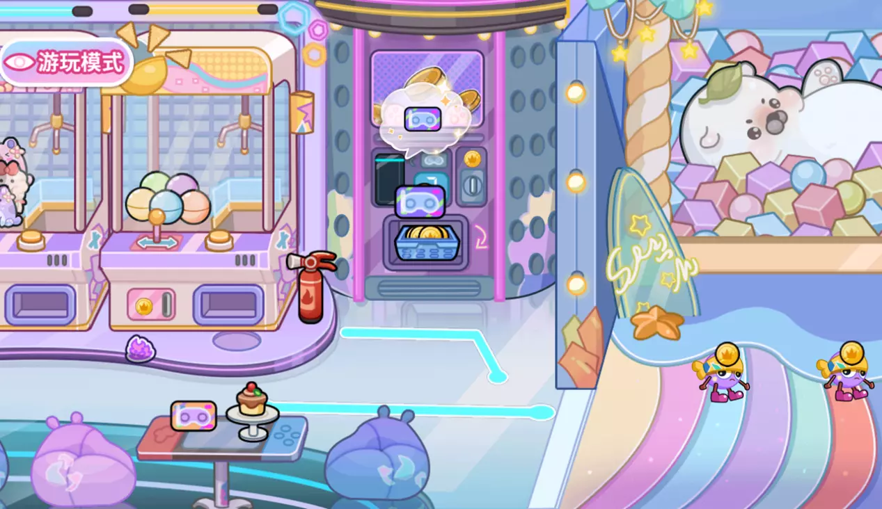 桌上的卡片不是摆设~把卡片拖动到出币机,会掉落大量的游戏币。可以先多拿一些来体验后面的游戏机。