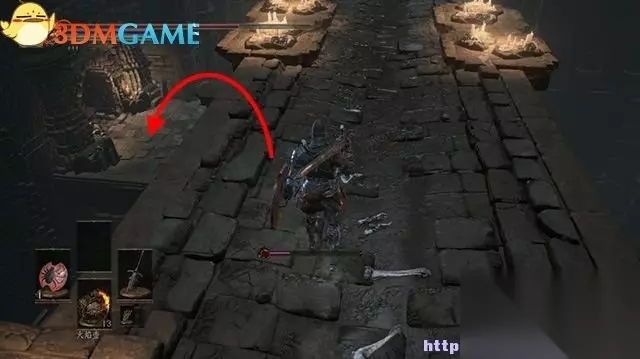 返回到地下水道打跳蛙的地方,沿着楼梯上去,依然是灰暗的水道。 穿过水道又是一道楼梯,上来后遭遇一名重甲守卫。 击杀他,在后面的岩壁上找到一条竖梯。 回到平台边缘,搜尸拾得“受挫骑士的灵魂”。