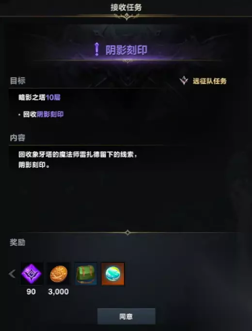 3、我们在任务队可以看到,在暗影之塔10层中可以回收刻印完成任务,获得岛之心。