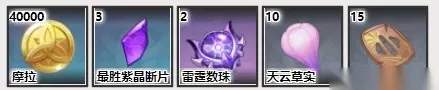 【40级】:摩拉40000、最胜紫晶断片儿3、雷庭数珠2、天云草实10、老旧的刀镡15。