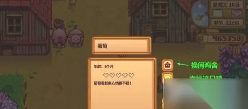 养鸡技巧分享 4、想建鸡舍得去找罗宾Robin制作,似乎需要不少钱、树木、还有石头。 5、有的人养了鸡之后,发现鸡不下蛋,那是因为你没有喂它们,需要手动喂。 6、非冬季不下雨的天气,打开鸡舍,鸡也会自己去找东西吃。 7、如果有足够资金,买个暖气,鸡会生长的更快。 孵化小鸡条件 1.鸡舍必须升级到有孵化器的级别,大概是二级鸡舍吧,将蛋放进去就可以孵化了。 2.鸡舍必须要有空位,大家都知道鸡舍都有数量限制的,满员的情况下可以孵化,但孵化不出小鸡来,等鸡舍腾出空位来,小鸡才会横空出世。 喂鸡方法 1、放养,在鸡舍的大门右下角有一扇小门,打开小鸡就可以出去找食物; 2、购买干草喂养小鸡,玩家可以前往玛尔妮的牧场购买; 3、玩家在条件允许的基础下,找木匠盖一座筒仓,在自家的牧场上割草喂食小鸡。 出优质大鸡蛋的方法 1.溜鸡。在鸡舍外有个小门,点一下就打开了,这个出口是让鸡散步用的,鸡出来散步可以自己找食物,并且心情愉快。傍晚五点鸡自动回归鸡舍,此时要把鸡舍门关起来,否则鸡心情差还可能被别的动物吃掉。 2.抚摸。在鸡不睡觉的时间段,抚摸自己养的母鸡。鸡的头顶出现红色爱心,说明鸡的心情变好了。注意这个和母鸡互动一定要多做,有条件每天都去摸摸,鸡的心情好了,就会生出优质蛋来。 3.环境。食物要充足,有自动喂食器的情况下要在家里建筒仓,没有的话要每天在食槽里放干草。另外还要注意的是冬天鸡是不出门的,一定要保证有取暖器+干草+抚摸心情才会好。 如何换鸡舍和卖鸡 点击任意一只鸡,然后如下图所示的两个图标就是换鸡舍和卖鸡,换鸡舍首先要保证那间鸡舍有空位否则没法换,卖鸡是不可撤销的操作,要慎重考虑。