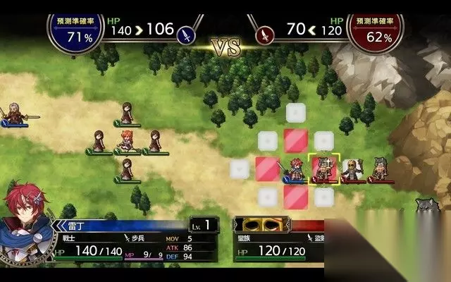 步骤2:移动/攻击 轮到我们的回合之后,使用键盘的上下左右键选择我方士兵(蓝色),之后地上就会出现大面积蓝色方块, 蓝色区域就是该角色的移动区域,任意选择一个格子就可以使其移动。 然后选择攻击,红色的格子就是攻击范围,当目标处于红色格子里面就可以发动攻击。