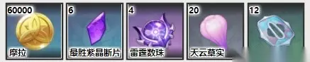 【60级】:摩拉80000、最胜紫晶块6、雷庭数珠8、天云草实30、影打刀镡12。