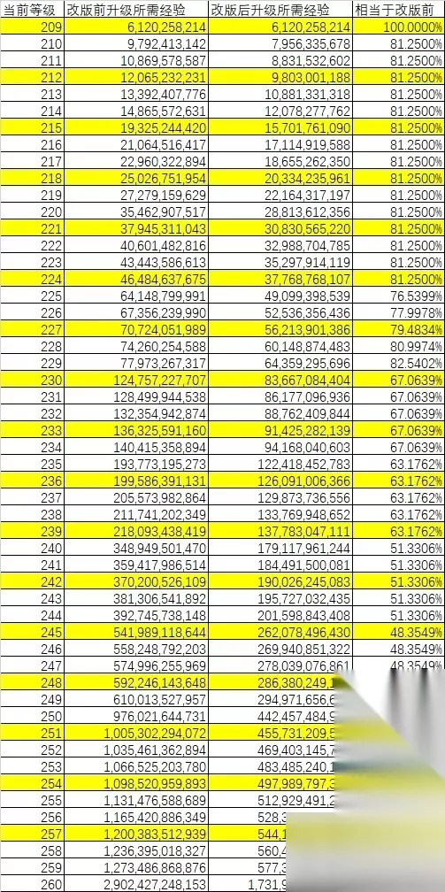 2、根据韩服的资料得知:六转等级是260级,而为了能让后来的玩家达到260级,除了升级所需经验值大幅减少之外,高能斗燃的最终等级也从250级提高到了260级。下面,就由我来依据韩服已知的情报介绍如何轻松迎接本次改版。 本次斗燃活动的规则也有所调整:新创建的角色的斗燃效果会从11级而不是10级开始生效,这样就能确保你能刚好练到260级。与此同时,和往届斗燃一样,你仍然可以指定已有的200-258级角色来参加斗燃。如果参加时的初始等级不合适,练到260级会比较吃亏。由于升级经验减少,卡好经验是参加斗燃的关键操作。 3、以下是六转改版前后,209-260级的升级所需经验表。其中,黄底纹的等级是参加斗燃时的推荐等级。 如你所见,升级所需经验减少幅度巨大。在以往,如果改版前卡了99.999%,那溢出的经验会在改版后随便打一个怪物之后推到下一级。但这次改版减了太多经验,因此韩服对已有角色参加斗燃提出了另外一条规则:如果改版前要参加斗燃的角色当前经验是溢出状态,就必须要先去打怪把溢出的经验推到下一级,然后才能参加斗燃。这样的话,你就很可能会错过参加斗燃的最佳等级。