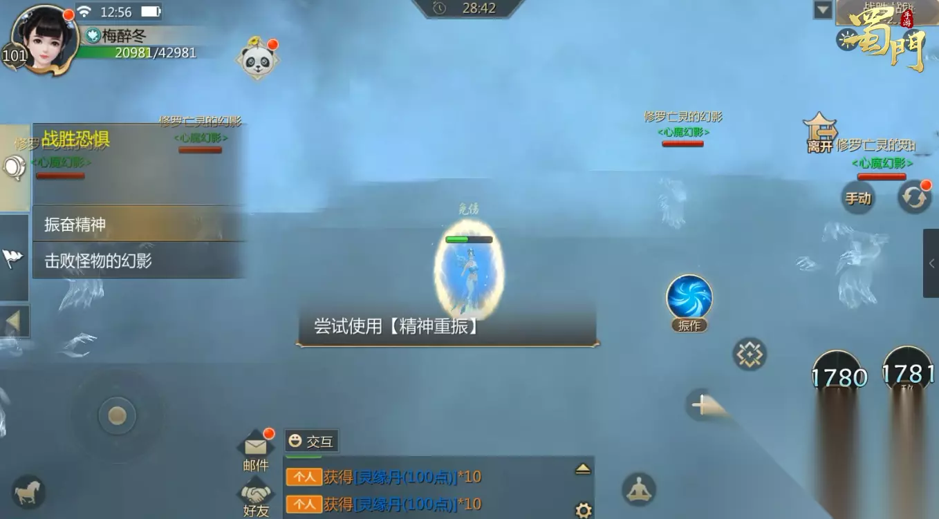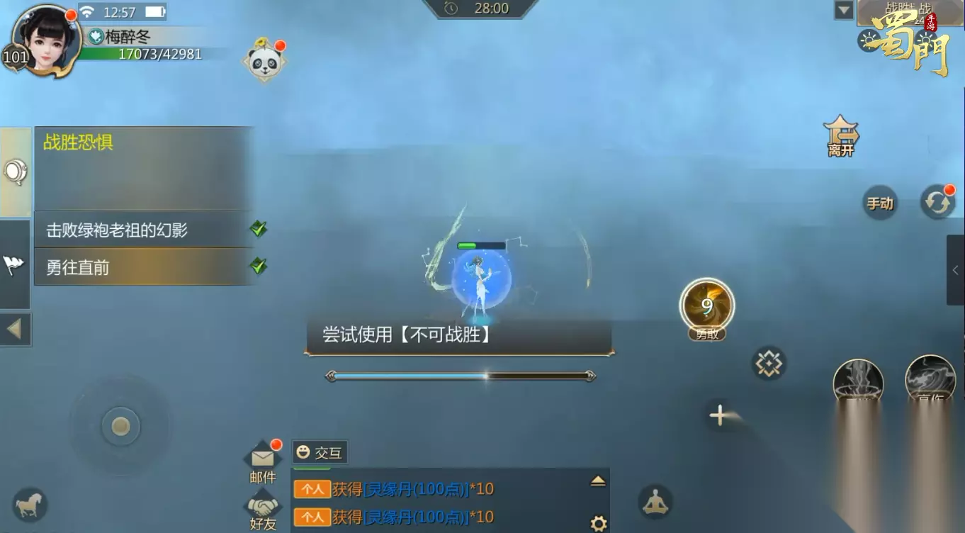 期间需要通关副本“战胜恐惧”。我们进入了月歌的神识,在对话后我们将变身成为月歌,依次使用右下角的五个技能,发现并不能将怪物击败。月歌有些气馁,晗露再次鼓励了她,点击出现的【振作】图标,想起了自己的能力,再次使用技能就可以对怪物造成伤害了。