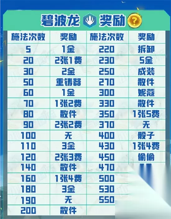 1、碧波龙云顶之弈S7.5赛季上线的一个趣味羁绊,有着特殊的机制。 2、在碧波龙的英雄释放技能的时候,可以叠加一层场上的海石。 3、在场上的海石叠加到一定的层数之后,就会有奖励可以领取。 4、碧波龙的奖励机制是固定的,海石层数累计到300/400/500层时。 5、可以得到妮蔻,骰子和自然之力,再之后可得的就是金币和装备。 6、所累积的层数越高,那么得到的奖励越丰厚,奖励非常的丰富。