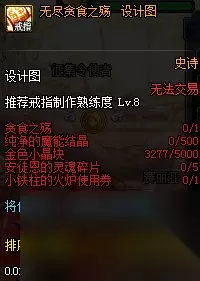 自从团队副本的负担减轻后,制作无尽贪食装备的难度也相应地降低了。制作荒古的主要材料不仅需要大红豆,还需要纯净的魔能结晶和金色小晶块两种材料。其中,纯净的魔能结晶需要500个,而金色小晶块则需要高达5000个。由于数量庞大,许多玩家只能选择从拍卖行购买这些材料。