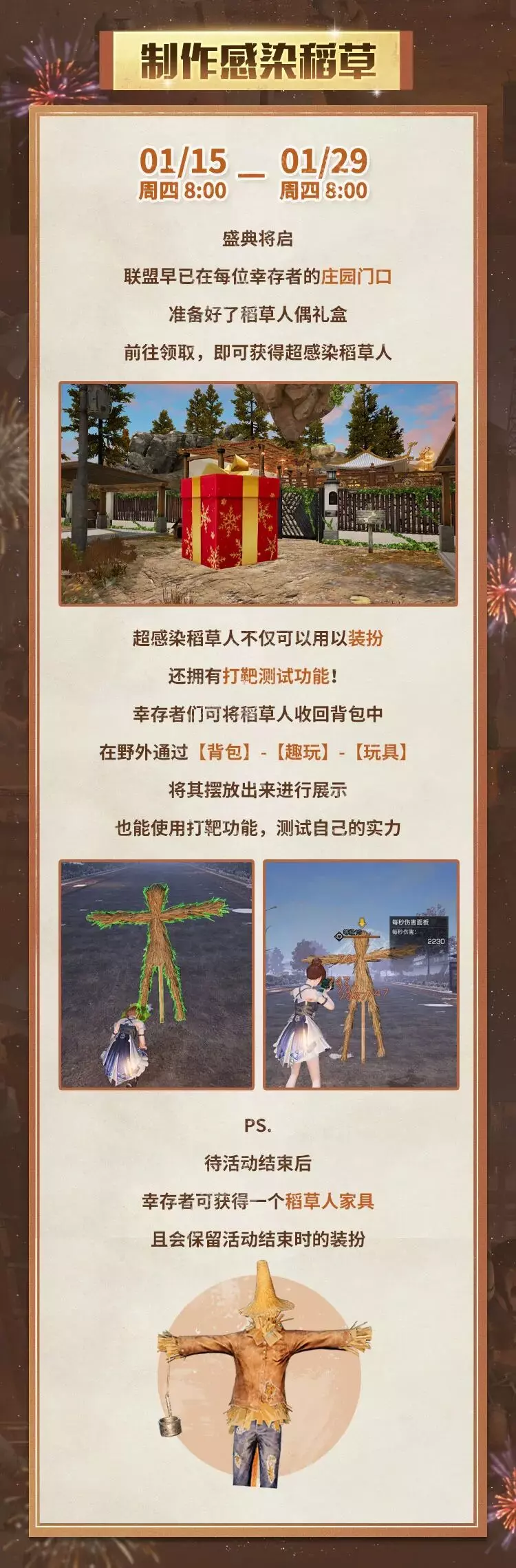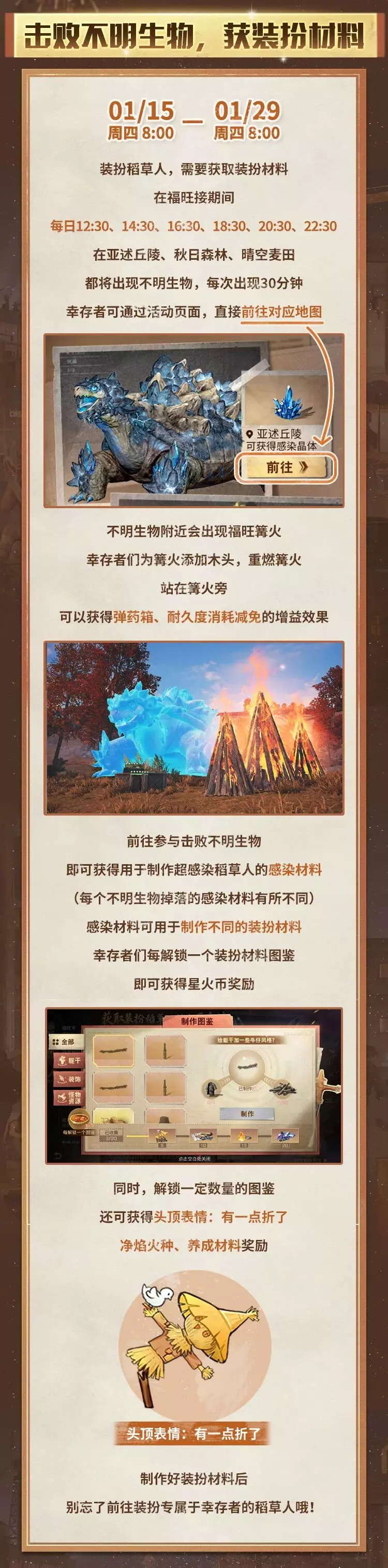 联盟的特殊赠礼一一“超感染稻草人"现已送达营地!1月15日起,深入荒野,夺取感染体的利爪与甲壳。与好友相聚在温暖篝火下,合力粉碎象征厄运的稻草人,于火光之中迎接新年旺福!